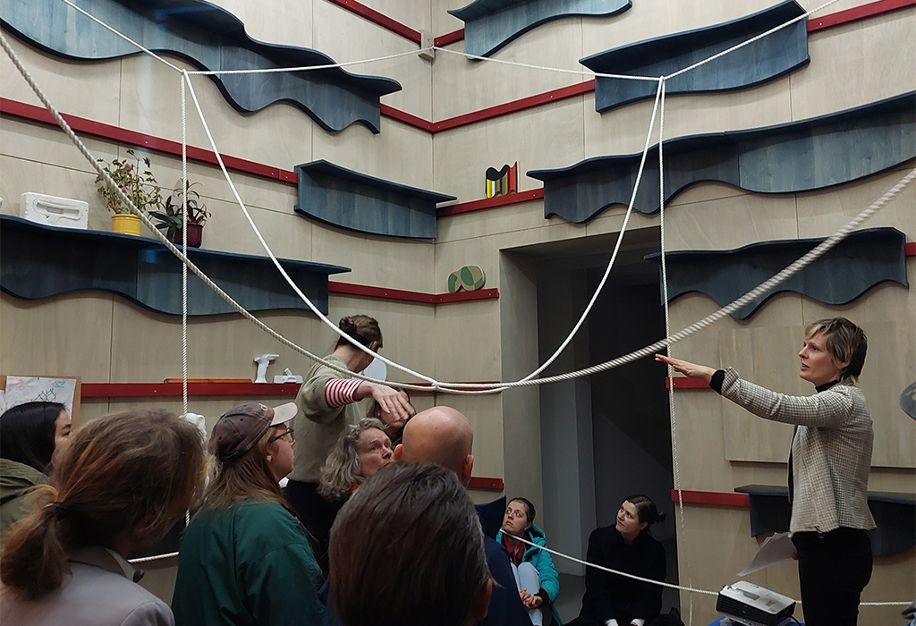 The first part of the presentation was conducted in a lecture-style format, where I, as the artist-researcher, introduced the performative installation as 'a context inside of other contexts': Gallery Entrée, normally a white cube, served as the contextual frame for the flexible interior built by Nordahl, which in turn framed the rope installation and performative presentation.