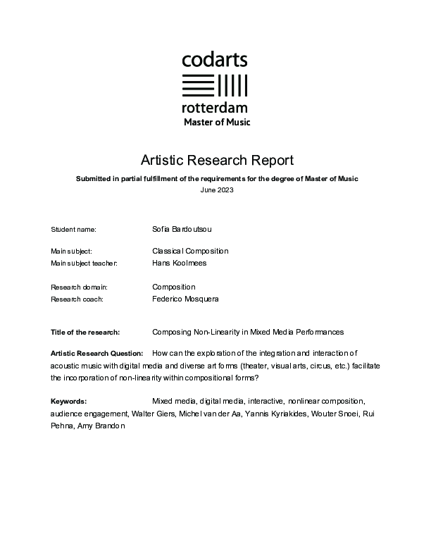 This paper aims to explore the potential of merging acoustic music with digital media and other art forms to create non-linear compositional forms. Often, it’s difficult to get away from traditional composition processes, make a piece adaptive in form and not strictly bound to time. Through case studies on works by Walter Giers, Michel van der Aa, Yannis Kyriakides and more, I focused on the elements of integration, interaction and nonlinear composition of different media. Looking at their work and through self- experimentation, I noticed that the different media can get dramaturgical meaning and interact live with every element of the performance. Digital media can specifically function as tools for interaction between the performers and the audience. By incorporating playful ideas in the compositions, derived from the world of games and indeterminacy, we can end up in nonlinear processes of performing notated music and allow for interpretation by other artforms. As a result, I composed the pieces In Medias Res for musicians, circus artists and interactive media, Dots for Pierrot ensemble and visuals, the 15’ opera Aer and the interactive music game A poppy blooms. Through this process, I tried to free myself, as a composer, from specific writing habits and approaches. A new field of possibilities opened up on how to develop music material, notate it and perform it.
