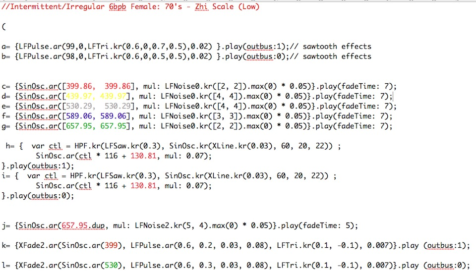 For those unfamiliar with SC programming language, an example of the most basic command might be: “{SinOsc.ar(440, mul: 0.1)}.play;” and this simply tells the SC synthesis server (scsynth) to evaluate, expedite and match the code command with a sound object; or put more plainly, SC plays a sine wave at the frequency of 440 Hz at a moderate volume (Wilson et al. 2011). As stated above, in order to faithfully convey the landscape of the body according to Chinese Medicine pulse diagnostics, sine waves are carefully modulated to exemplify the signature qualities of pulse waveforms as described in the notations (as in Figures 7 and 8 above). For example, the command “{SinOsc.ar(440.dup, mul: LFNoise2.kr(4, 3).max(0) * 0.009)}.play;” corresponds to an aspect of a pulse emitting a “fine, slow, and irregular” oscillation along the “Spleen” channel. Each of the channels are associated with a colour (as mentioned in the Composition section) and this is represented in the colour-coded SC text below in Figure 11.