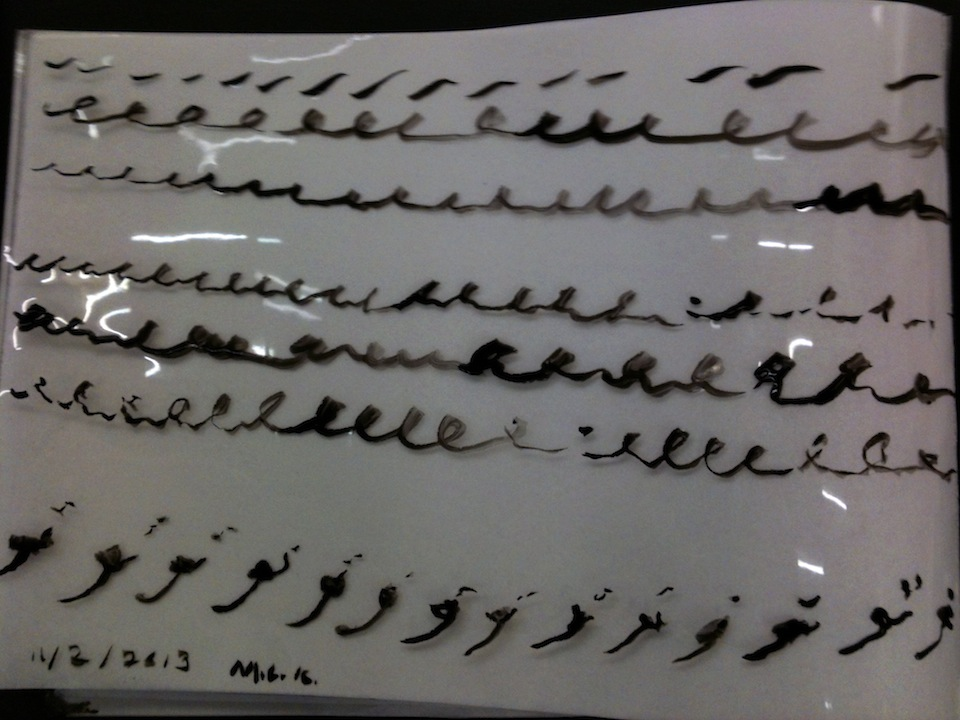 The performance itself is staged in a public space using the simple props of a table, chair, note paper, ink, brushes, acetate, a laptop and a white coat. This performance is easily introduced into most public spaces (given proper permissions, etc.) and always attracts the attention of onlookers. In the interests of conducting my study ethically, those interested enough in the event are asked to review the participant information sheets before active participation in the performance study, circumventing any ethical issues. Participants’ pulses are individually recorded and interpreted. The collection of data is modelled on a medical history or “case-study” basis. Clinical impressions of the pulse are first notated (see Figure 7), e.g., “bowstring,” “slippery,” “replete,” with the speed, vibratory qualities, fullness, emptiness, etc. Each organ-network (channel) is characterised and hand-drawn into a graphic notation. Each participant is given an individualised graphic notion during the performance and a SC soundscape file composed uniquely for them post-event (see Figure 8). The graphic notations and “clinical” notes are used post-performance to translate each person’s pulse into algorithmic compositions of modulated sine waves using SC (refer to Figures 7, 8 and 9). The notations and compositions of each participant constitute individual samples of the overall research project which is archived online. *
