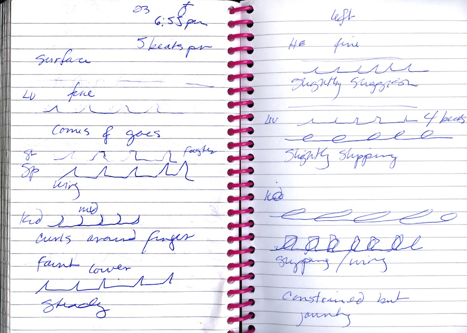 Pulse Project introduces a new method for touching and transposing sound that uses ancient and pre-modern approaches to the body to reconsider contemporary practices. Through my sonic portraiture, I attempt to convey my findings on the “living” body. As human touch bridges self with other, the development of a science of touch based on the model of early Chinese pulse diagnostics is being used in this study to challenge and widen contemporary medical and technological discourse. This method for touching sound (or touching as listening) attempts to create sonic expressions that are faithful to the complexities and mysteries of human experience and existence. Instead of creating another human/machine interface which is “interactive” and “user-focused” (thus mediating participation), this study publicly explores direct participation through using the creation of intimacy between the artist and audience as a context for conducting sonic research. As a response to the participant offering themselves to be read, the graphic notations and bespoke compositions are given freely as “gift” to exist as a unique form of visual and sonic portraiture of the participant, as an aesthetic document of the intimate, and temporally significant, encounter between practitioner and participant.