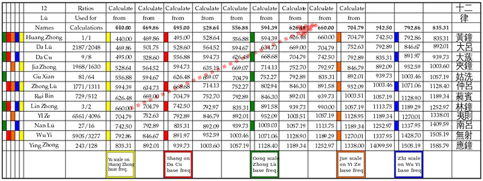 Moran, Patrick Edwin (2011). Chinese Music and Gamut and Scales. Citation for first two columns but with 16384/19683, 131072/177147, and 32768/59049: Joseph C.Y. Chen (1995). Early Chinese Work in Natural Science: A Re-examination of the Physics of Motion, Acoustics, Astronomy and Scientific Thoughts, p. 99. wikimedia commons. Retrieved March 10th, 2013, fromhttps://commons.wikimedia.org/wiki/File%3AChinese_Music_Gamut_%26_Scales.svg. Image: Creative Commons Attribution-Share Alike 3.0 Unported license.