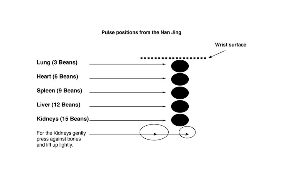 Though the diagnostic approach to pulse taking is consistent in terms of where and how pulse investigation is conducted, i.e., the positions of the fingers on the wrist, the ideal forms of wave-images for each organ-network, etc., there are multiple methods for pulse diagnosis in Chinese medicine. For example, according to the Huang Di nei jing (cited in section 3), each pulse has a position and depth at which it is ideally palpable (Adams 2006;Unschuld 1986: 117). For example, at one end of the spectrum, the Lung waveform is ideally palpable at the pressure level of three “beans” and at the other, the Kidney is ideally at the pressure level of fifteen “beans” (seeFigure 4). If the wave-image expresses itself in the “wrong” place, i.e., at other levels than where it is ideally meant to be, this has significance as to the condition of the organ-network. For instance, if a percussive “bowstring” sensation, which ideally belongs to the register of Liver/Gall Bladder waveform expressions, can be felt at the level of 3 beans (which is at the level of the Lung/Large Intestine) instead of the location of 12 beans (the ideal level of the Liver/Gall Bladder pulse), this means a discordant relationship is developing between the Liver and Lung organ networks (Adams 2006: 26). Each of the organs and networks (known as zàng-fǔ) are also associated with an element, colour, tone, etc., which is further discussed in the “Composition” section below.