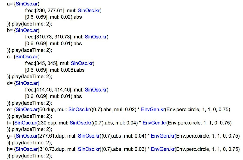 My use of SC programming language (sclang) is basic, keeping to simple commands so I can intensify my focus on listening to and modulating the sine wave shapes, characteristics and amplitudes within each programming command in order to match the fluid and electric-like nature of the vibrations I feel within people’s pulses. This is so as to match, with as much fidelity as possible, the vibrations appropriate to SC ugen (basic synthesis operators) commands. There is also an interpretative and intuitive element to reading peoples’ pulses which is central to my composing a sonic “portrait” of others, and this allows me to place the “human” within the mechanical instead of the other way around, as a disruption of the posthuman turn in new media (refer to section 5 for further discussion).