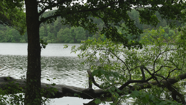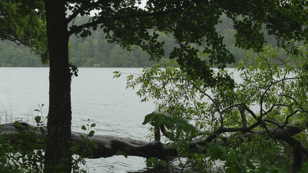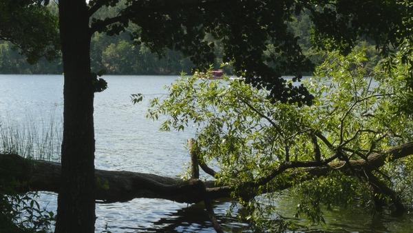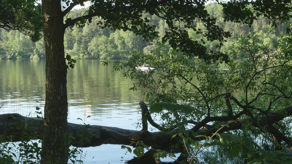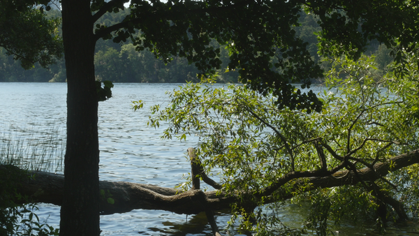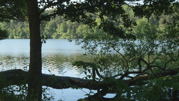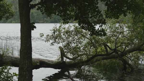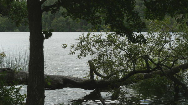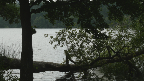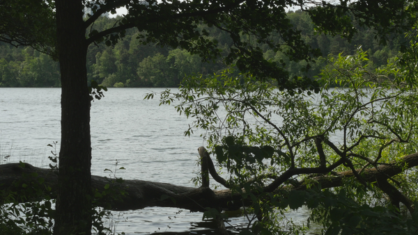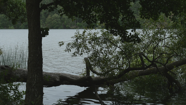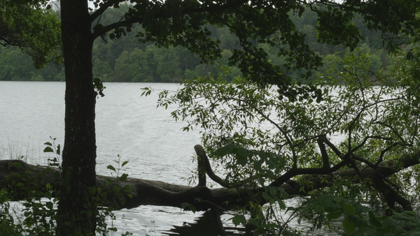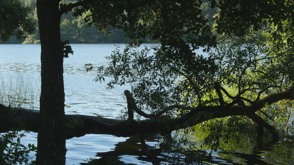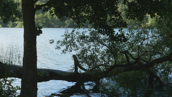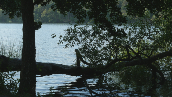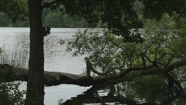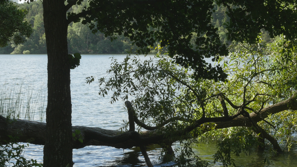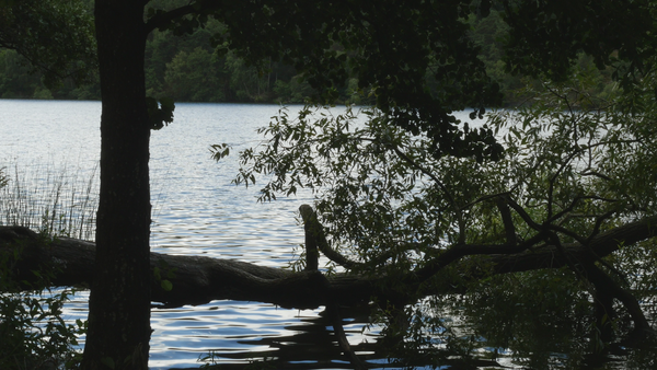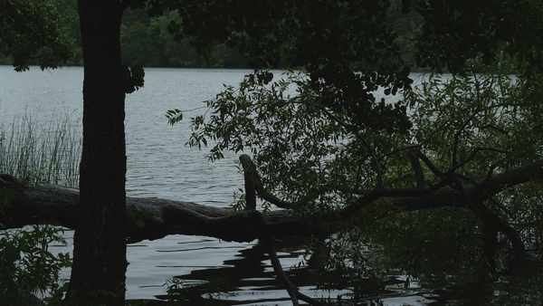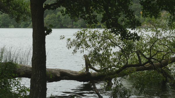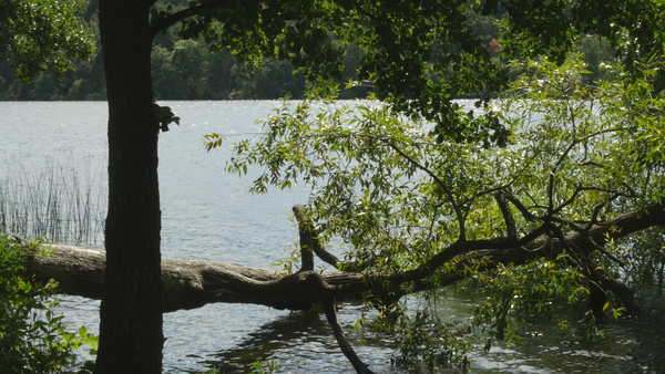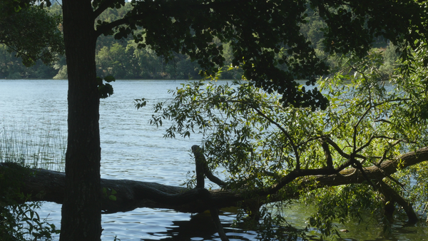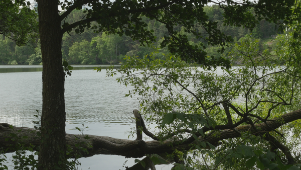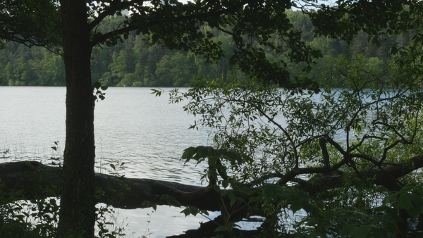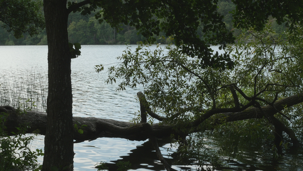 The project at Söder was a continuation and variation of my practice at Solsidan, in a park near my new home for the summer at Södermalm in Stockholm, a former working class area near the city centre. This time I chose to record only one image every morning that I stayed there from June to August (4.6.‐31.8.2016). Each morning I walked down to a nearby park, to the path following the shore and placed my tripod next to the path. A tree trunk, a silver willow, was lying horizontally over the water, and another tree trunk standing vertically next to it, an alder, formed a cross with it, with the water as background. I recorded this cross formed by the trunks across the path, thus including all the people passing by in the image, mainly as quick shadows, without heads – running, walking, bicycling, alone or in groups. There was no way I could avoid them, so I decided to record their movement and trust there would be enough sequences without passers-by to choose while editing. Soon, however, I discovered that people passing by where actually quite fascinating, and began to wait for passers-by to show up before starting my recording. I had recorded passers-by before, in Three Shores (2004), as small figures in a distance, whereas the passers-by now were so close they were hardly visible. At first I had some vague idea of entering the image, sitting on the horizontal tree trunk, but soon abandoned it. This was a public space and I wanted to make my image discreetly; moreover, the passers-by served as performers, they provided action enough.