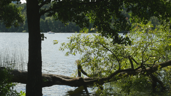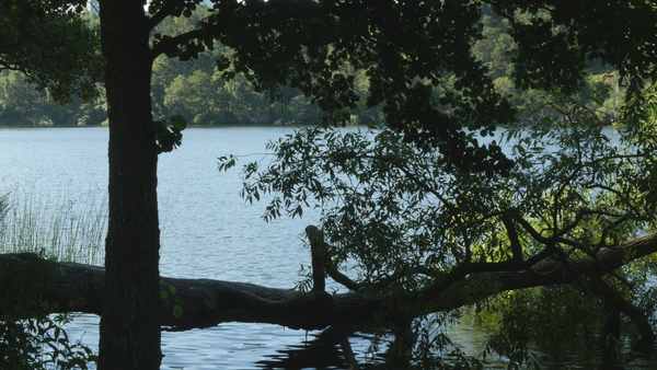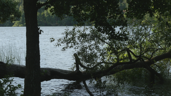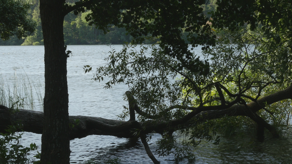 The project at Söder was a continuation and variation of my practice at Solsidan, in a park near my new home for the summer at Södermalm in Stockholm, a former working class area near the city centre. This time I chose to record only one image every morning that I stayed there from June to August (4.6.‐31.8.2016). Each morning I walked down to a nearby park, to the path following the shore and placed my tripod next to the path. A tree trunk, a silver willow, was lying horizontally over the water, and another tree trunk standing vertically next to it, an alder, formed a cross with it, with the water as background. I recorded this cross formed by the trunks across the path, thus including all the people passing by in the image, mainly as quick shadows, without heads – running, walking, bicycling, alone or in groups. There was no way I could avoid them, so I decided to record their movement and trust there would be enough sequences without passers-by to choose while editing. Soon, however, I discovered that people passing by where actually quite fascinating, and began to wait for passers-by to show up before starting my recording. I had recorded passers-by before, in Three Shores (2004), as small figures in a distance, whereas the passers-by now were so close they were hardly visible. At first I had some vague idea of entering the image, sitting on the horizontal tree trunk, but soon abandoned it. This was a public space and I wanted to make my image discreetly; moreover, the passers-by served as performers, they provided action enough.