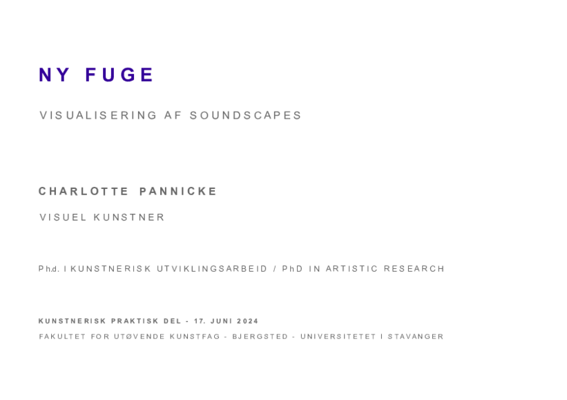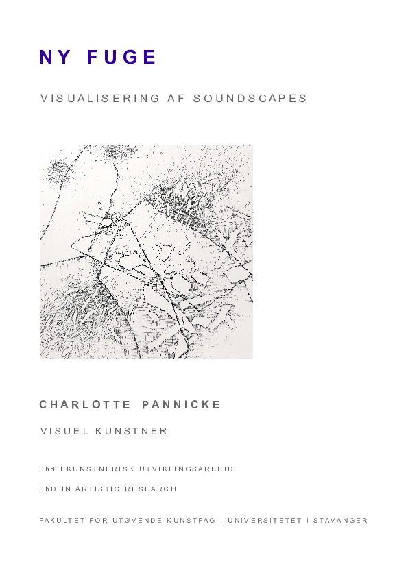 NY FUGE – visualisering af soundscapes refers to an area where artistic expression in the form of hand drawing evolves, questions itself, changes and renews itself. The project is an exploration of the relationship between sound and image at the center of artistic expression. - Questioning how knowledge arises, is used, reused and changes in unknown contexts. I work with graphic translation of acoustic areas via hand drawing in two selected sound- scapes with Hi-Fi and Lo-Fi contrasting qualities in a remote and an urban soundscape. Parallel to the artistic development, I explore underlying / inherent processes of artistic work in my case. I am questioning the way in which the present and past experience interact and what role intuition, imagination, reflection-in-action and, not least, the knowledge of the body play in the artistic space of action. I am focusing on the active act in the present moment, where I draw, where my artistic expression takes shape and manifests itself. In the project, I seek to move closer to an understanding of how artistic knowledge is developed during creative work processes.