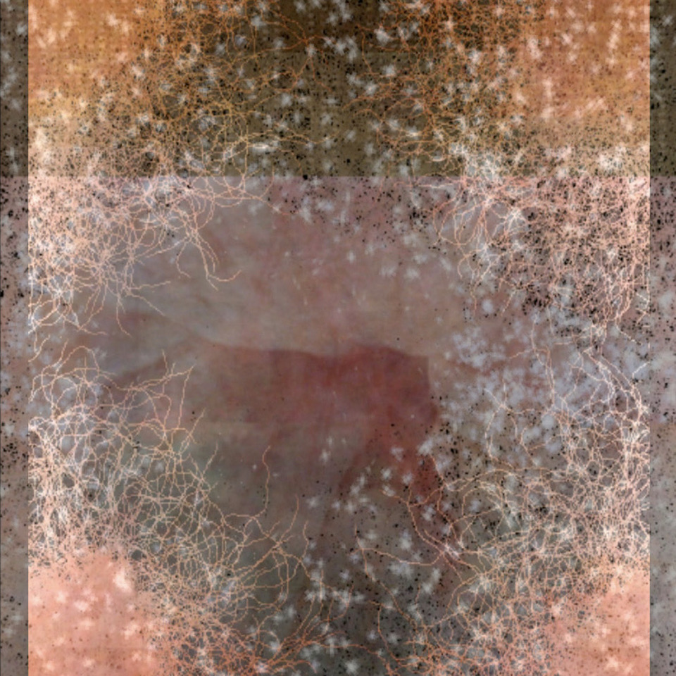 The diverse play of time and space in the two-dimensional phenomena of this monochrome world (a world without realistic techniques) is created by a tapestry woven by the overlaps and gaps of its superficial rhythmic layers. Thereby, my understanding of this digital painting that Nechvatal calls rite Of spring is that algorithmic time intervenes. Immersion into noise (whether viral algorithmic activity is noise or not) is the template that is created and constructed by a script that forms a new spatiality. Is that new spatiality that of erosion? If so, it is completely different from the erosion of a biological virus as it functions in an environment in which there is no smell, no sound, and nothing can be said to the existence of metadata.