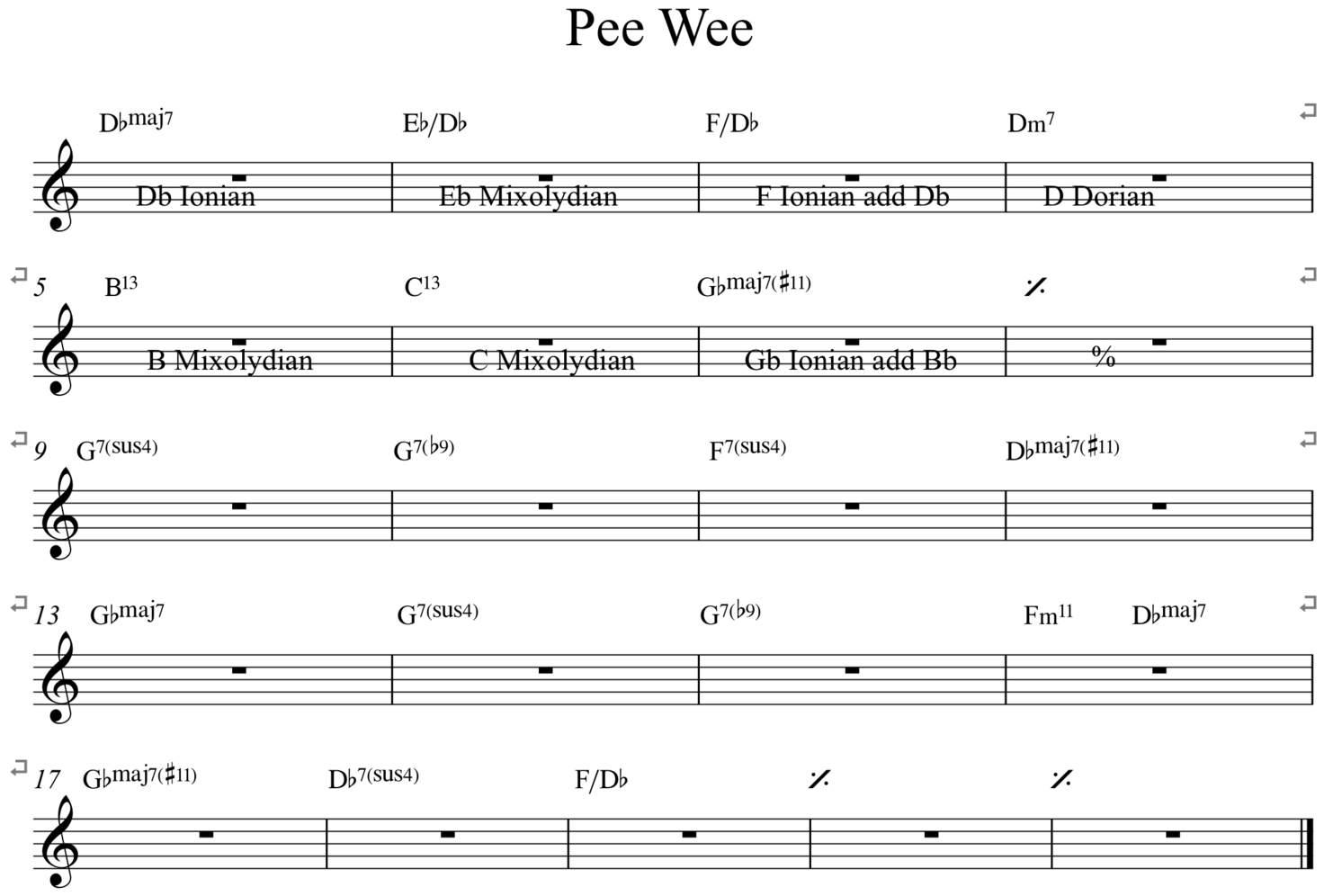 The Chord structure of Pee Wee by Tony Williams. In the first four bars I propose underlying scales/modes to be used for improvisation.