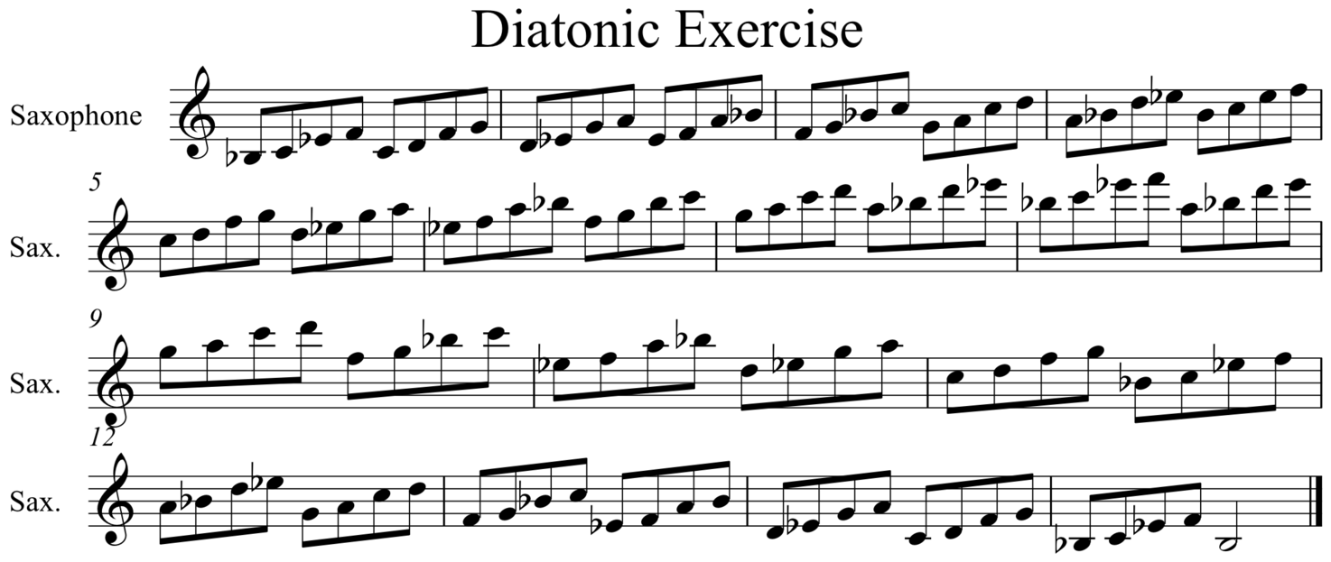 After basic sound exercises, I argue that practicing basic scales is of greatest importance, particularly for a jazz improviser. In jazz, scales are the building blocks, and here arpeggiated chords derived from scales are included. How to design scale based exercises as efficient as possible? There is no clear-cut answer, but one hallmark of a professional musician is their ability to design exercises that meet their artistic needs. As a saxophone student in the early 80s I took some lessons from the Norwegian saxophonist Jan Garbarek, who at the time was one of the most influential saxophone players world-wide, particularly after his participation in Keith Jarrett’s European quartet.[4] How did Garbarek practice? It turned out that Garbarek’s practicing habits was highly structured.[5] He asked himself: how can I be sure to cover all common scales in common combinations on my instrument in my exercises?[6] Accordingly he designed a series of exercises to meet this criterion. Without going into details, the basic idea is that there are basically two diatonic scale types in use in jazz-based music with regard to the pattern whole-half steps: the Ionian (or major), and the melodic minor scales. All other diatonic scales are modes of these two. In addition, there are the diminished scale, the whole-tone scale, and others that can be treated in the same way. The exercise, in my interpretation, looks like this: 1) choose a scale type and scale (switch between Ionian and minor melodic based scales each day), 2) design a pattern that should be played on the entire range of the instrument, start at the low Bb, and 3) practice the pattern starting on all twelve keys. With a basic number of patterns, designed and chosen at your own discretion, and with a balanced mix of patterns that primarily features seconds, thirds and fourths one covers all note combinations in a couple of weeks. It is advised to also group notes for rhythmic variation, e.g. three, four and six notes patterns, and then for instance dividing a three-group pattern in four notes and vice versa. The combinations are almost endless. Here is an example of a basic exercise in Bb major.