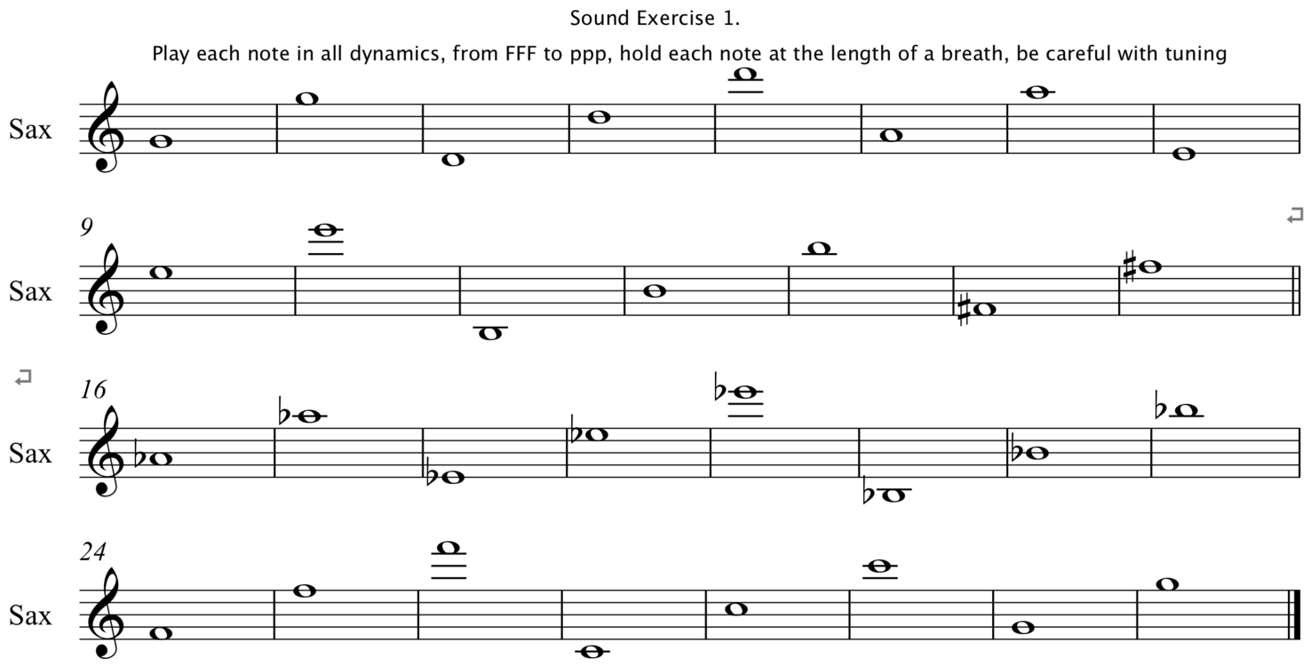 The saxophone is a musical instrument designed with music making in mind, despite that the saxophone is capable to produce a huge and varied sound palette, including non-harmonic and noisy sounds. As mentioned previously: on a saxophone, the player produces its sound with her body, and according my opinion the importance of mastering sound production cannot be underestimated. Therefore, practicing basic sound production skills is fundamental and each practicing session must contain such exercises. The basic sound exercises are performed by playing long notes in the instrument’s entire register, and each note should be performed in different dynamics, from the strongest to the weakest and in a number of degrees in between, so called terrace dynamics. Still used today is an exercise collection designed by the German - American classical saxophone player Sigurd Rascher in the 1920s. His thin book Top Tones for The Saxophone is basically a method to learn to extend the high register of the instrument up to four octaves, but his exercises has been proven very useful for developing and maintaining basic sound production skills as well. An example of a sound exercise derived from Rascher is shown in Sound Exercize 1.