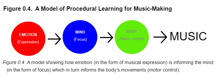 I believe that the approach investigated by Williams is quite analogous to my research, as I am essentially exploring the role of focusing on a specific type of movement whilst singing as a type of external focus. In fact, Williams explains that when musicians concentrate on the outcome they want to achieve instead of getting caught up in technical details, they are facilitating a learning process that involves doing rather than just being told what to do. This type of learning, known as procedural learning, involves acquiring skills through repeated practice and performance rather than through instructions. In other words, virtuosity is achieved through active engagement and practice, rather than simply being instructed on what to do2. Williams exemplifies this process in the following diagram3: