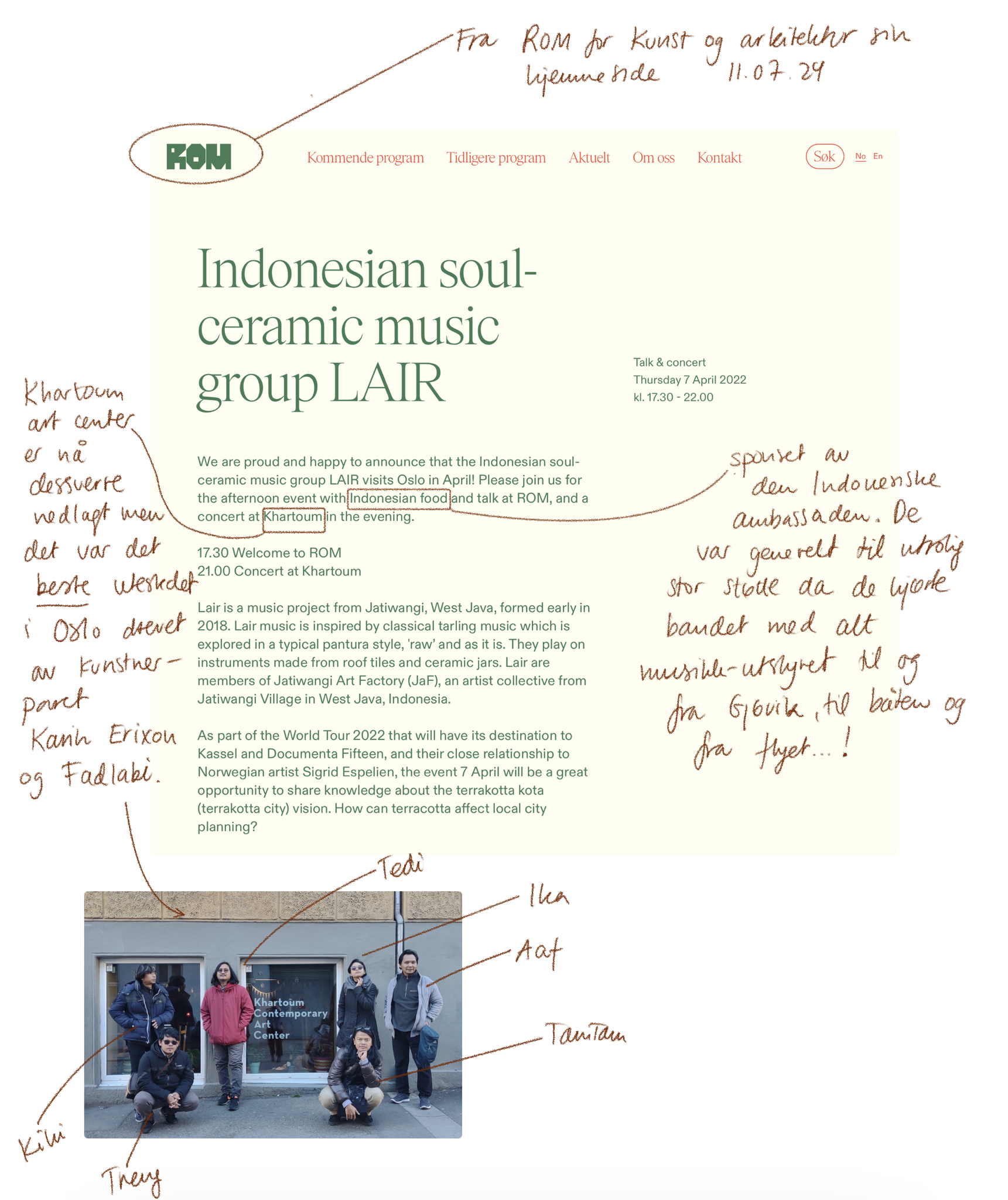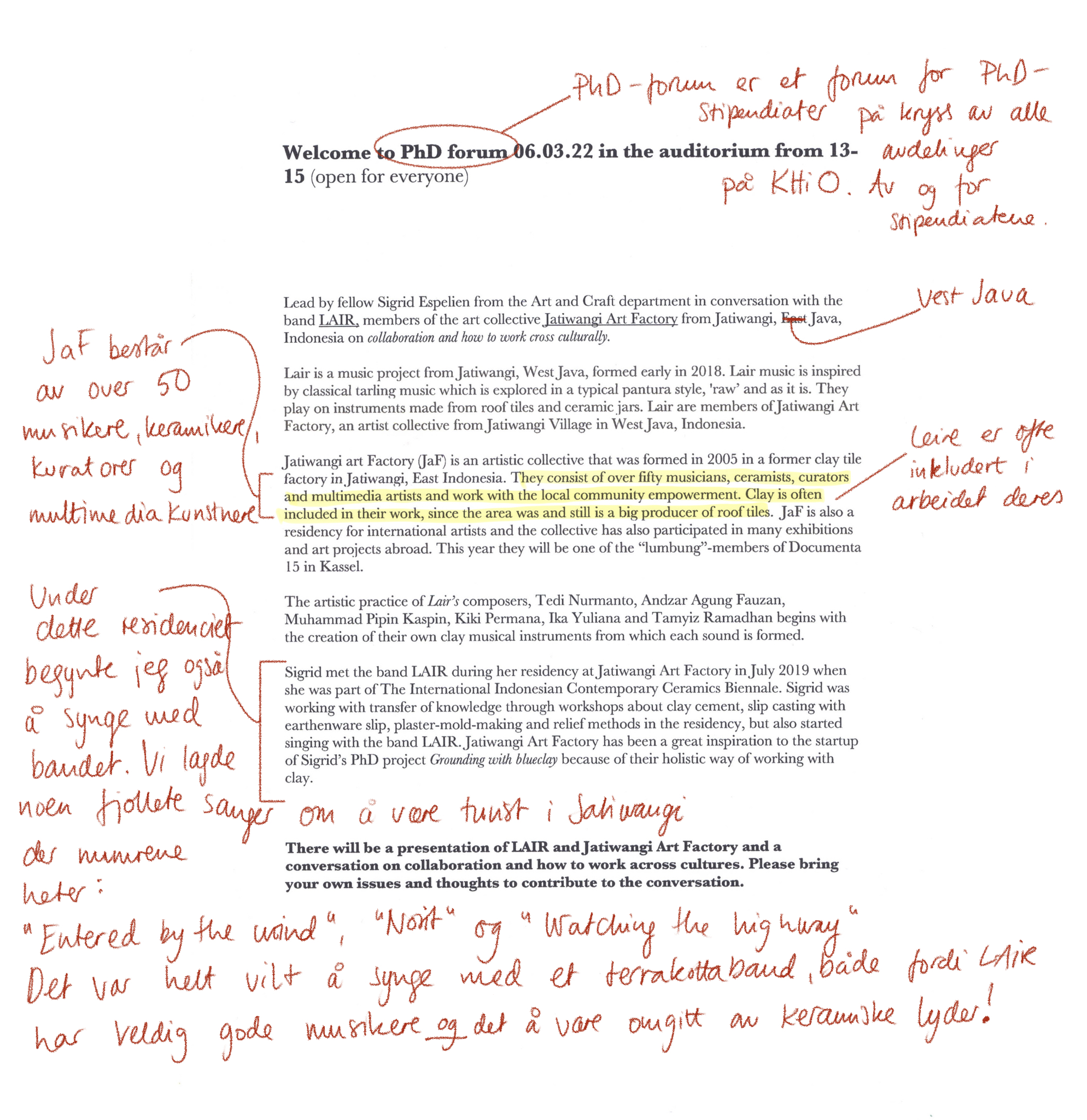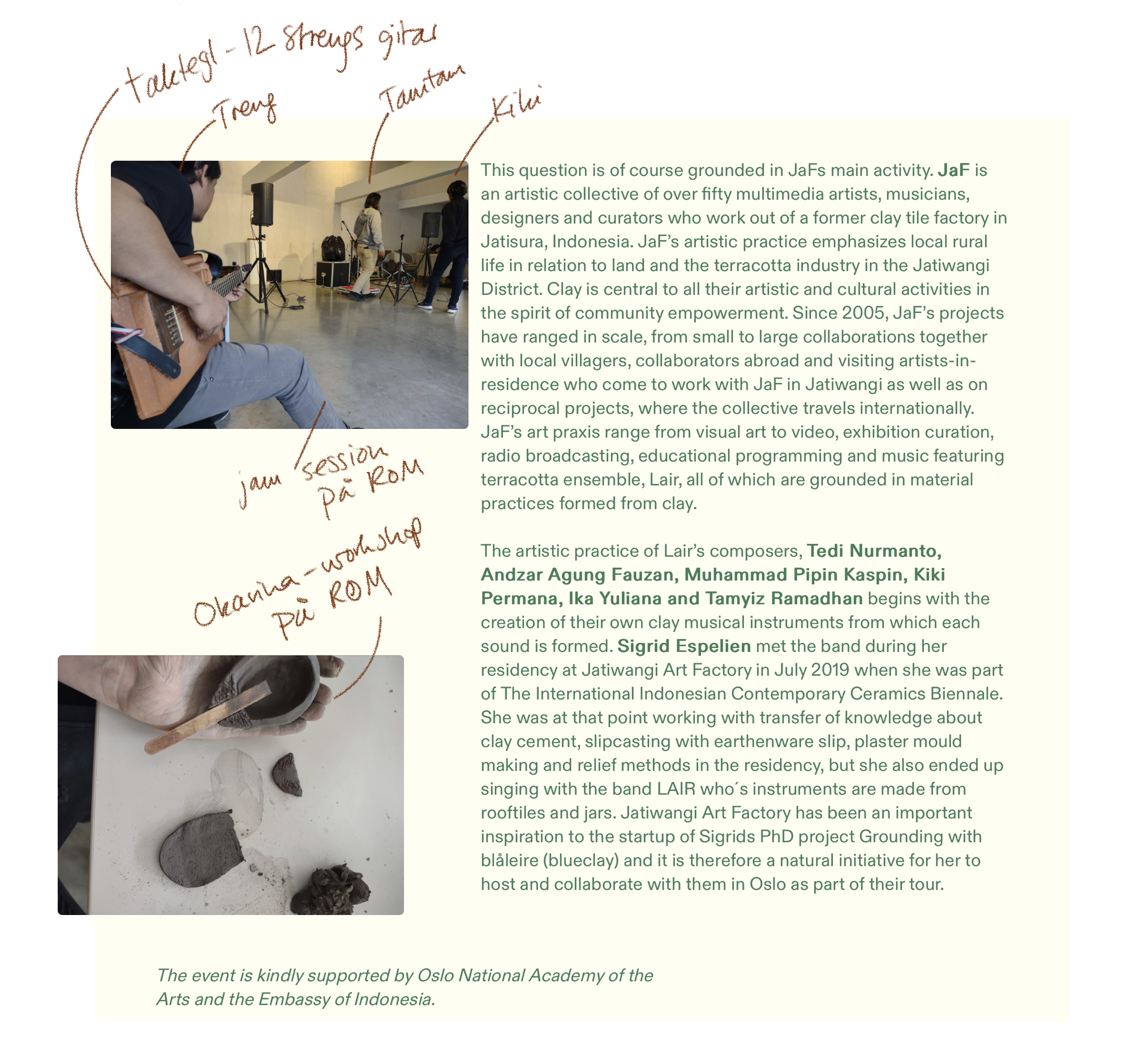 I april 2022 kom LAIR på besøk til meg i Oslo som en del av deres Terracotta World Tour, der andre destinasjoner var Torontobiennalen, Næstved i Danmark og Documenta 15 i Kassel, Tyskland. Jeg kjenner bandet fra da jeg var på residency i Jatiwangi som en del av Indonesia Contemporary Ceramics Biennale i 2019 og også fra tidligere besøk. LAIR og JaF er en stor inspirasjonskilde og referanse i PhD-prosjektet, men også generelt i min kunstneriske praksis. For å starte med noe grunnleggende; ordet tanah på indonesisk betyr både land, jord og leire, og er beskrivende for hvordan leire er integrert på en annen måte inn i samfunnet i Indonesia kontra Norge.