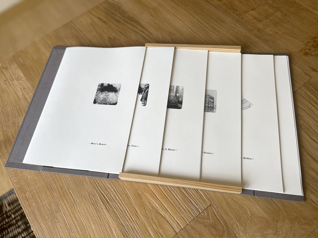 - an artist book enfolding six loose signatures or pamphlets, each comprising a different grid print, theoretical statement, specific image-text network, and sample from the resulting hexadecimal code of the specific grid.