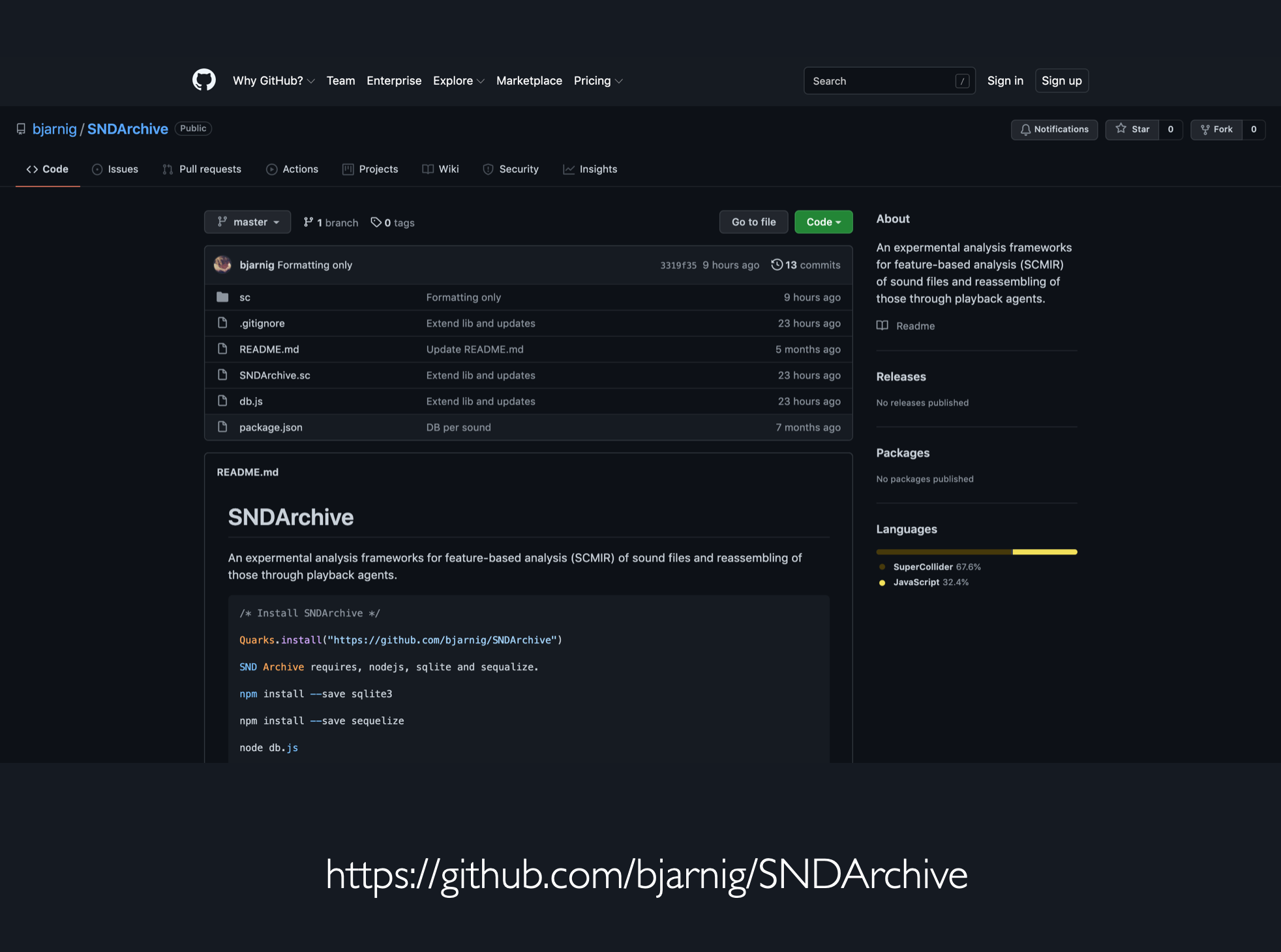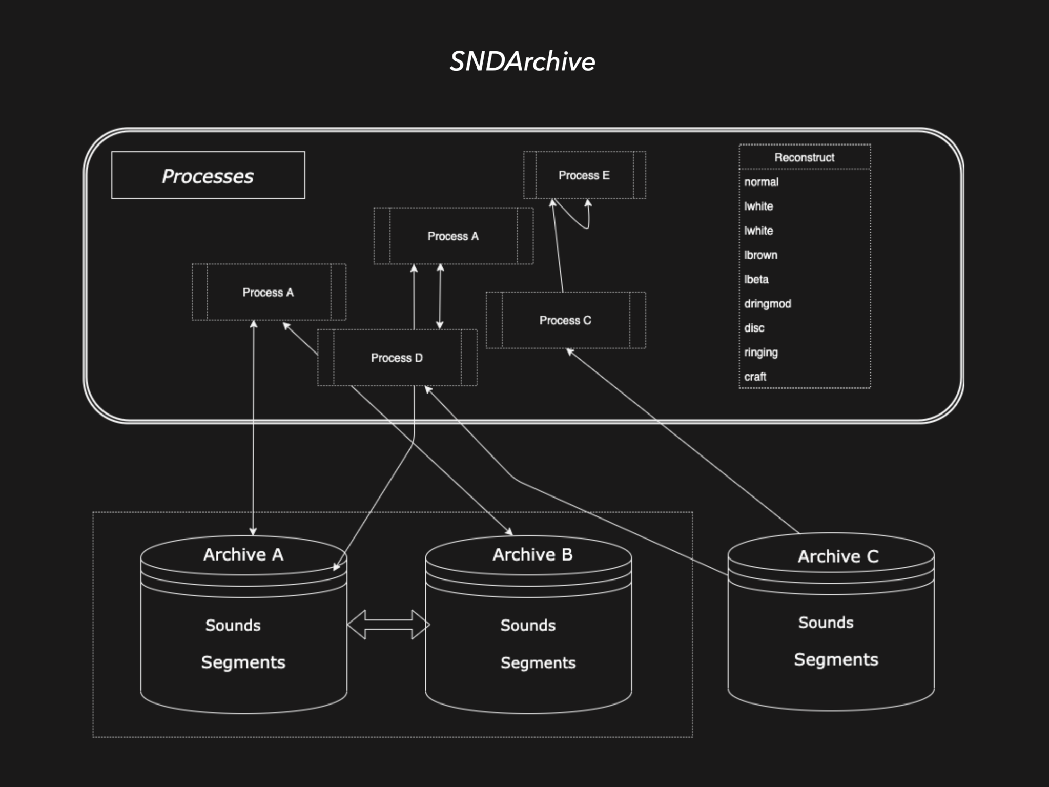 Applying the attitudes of data science meant to compose by querying the database. To ask questions or make queries based on data properties of the set as a whole. The SNDArchive system further allowed me to recompose and combine sound parts based on different dimensions discovered through offline analysis processes. My task then became to make queries and selections on top of sound directories and choose how they would be played back. The music emerges through processes that interpret the sound or sound segments, transforming them or developing synthetic sounds based on their properties. The idea is to create methods for engaging with the sound archive, to review it from a different angle or to reveal previously unknown aspects of material already loaded with meaning.