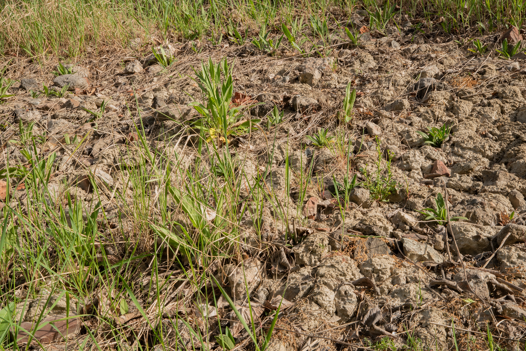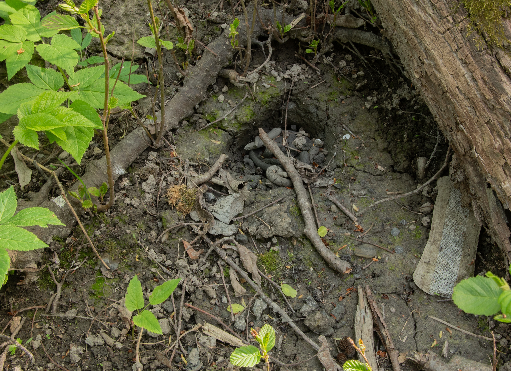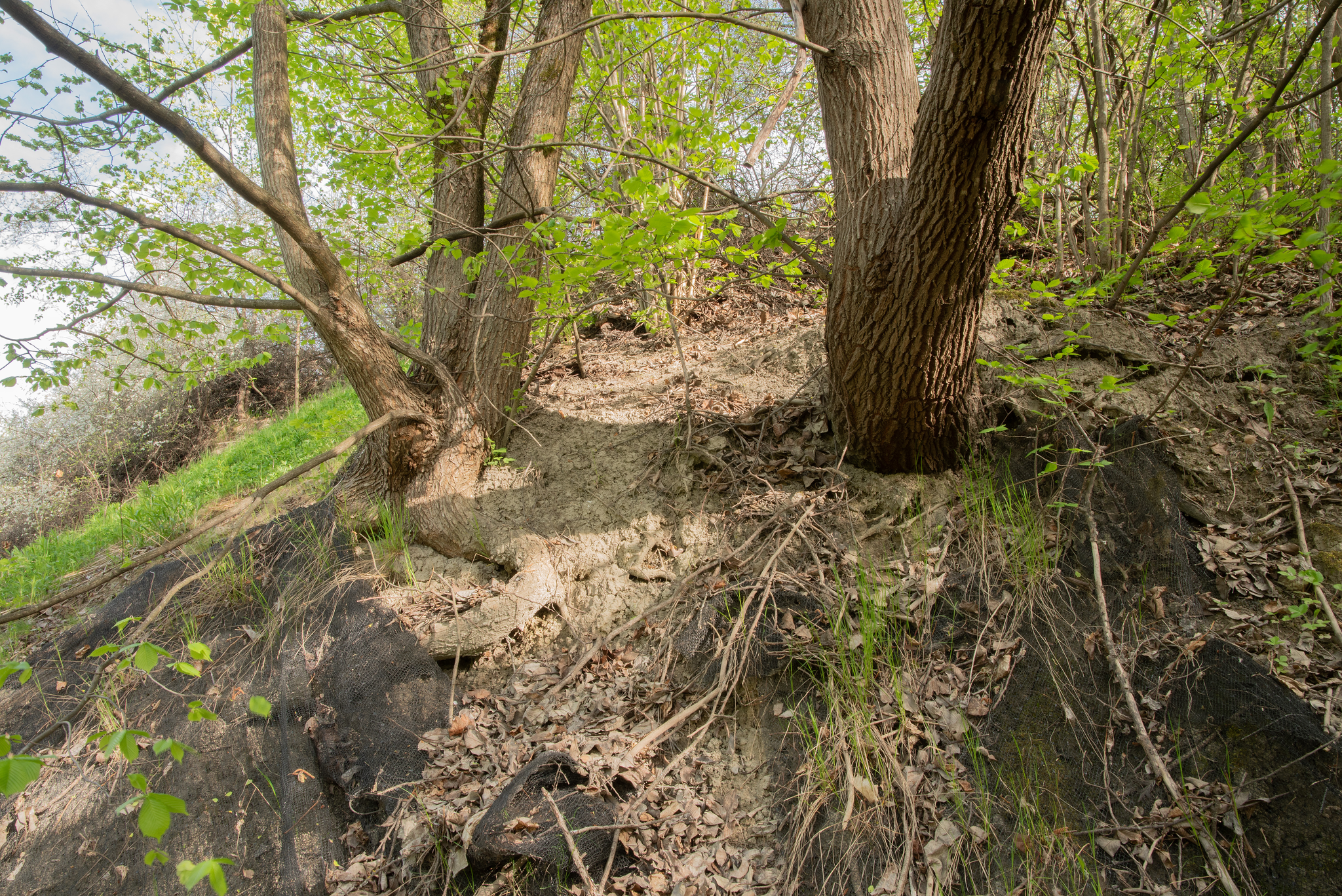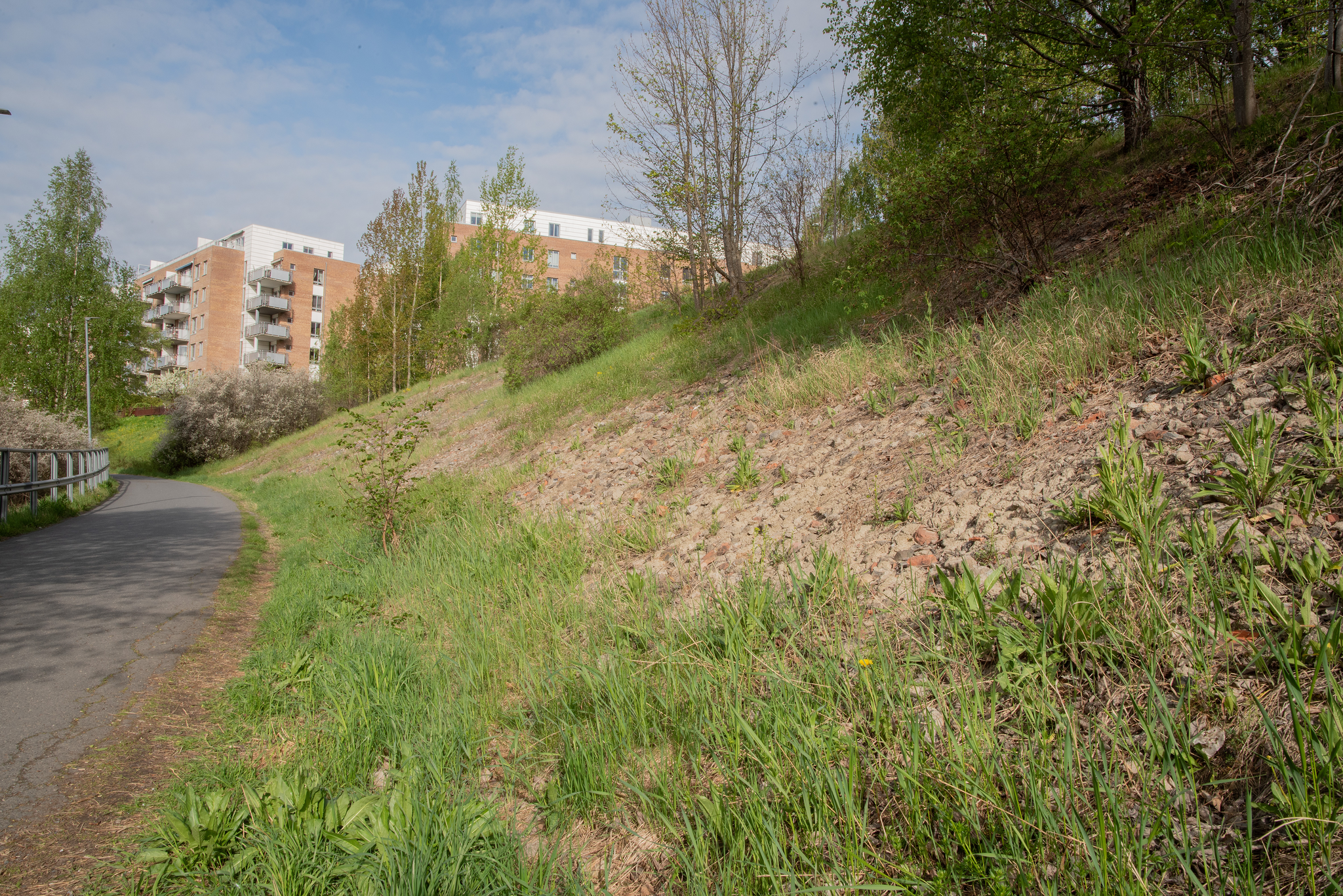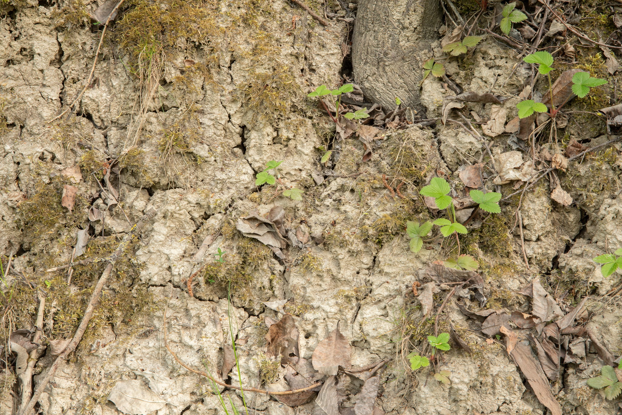 Skråningen (c) har også brunleire, som er ganske lik den under treet. Forskjellen er at den er mer forurenset av andre ting. Dette har nok vært en plass der materialer fra byggeaktivitet i området bare har blitt dumpet. Vi kan tydelig se et konglomerat av sement, fliser, tegl, stein, asfalt, betong og leira er som et lim som holder alt sammen.