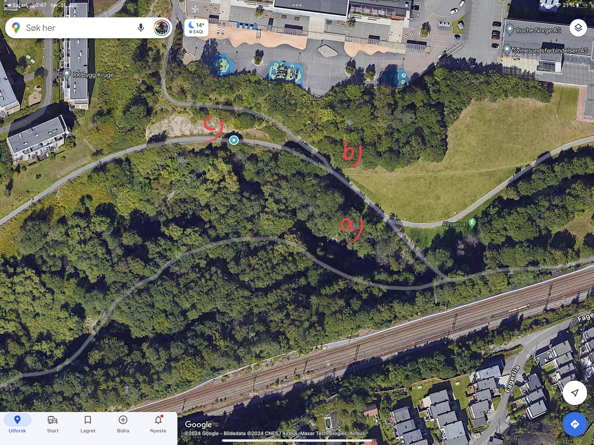 Skjermdump fra google map: a) leirelandskap nede ved elva, der leira er blågrå. b) Brunleire fra under et tre og bortover en skrent, der leira er oksidert og blandet med det øverste laget av jord og hummus. c) Brunleire i en skrent der det også har blitt dumpet andre materialer som sement, asfalt, tegl, betong og stein.
