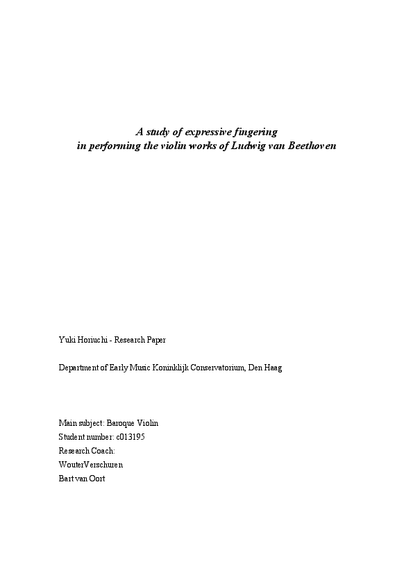 Name: Yuki Horiuchi Main Subject: Baroque Violin Research Coach: Wouter Verschuren Title of Research: A study of expressive fingering in performing the violin works of Ludwig van Beethoven Research Question: To what extent can we apply the 19th-century style of expressive fingering to violin works by Ludwig van Beethoven? Research Process: What are the best sources to consult regarding Beethoven’s violin fingering? In the 18th century, the most influential source of information on violin fingering is Leopold Mozart’s Versuch einer gründlichen Violinschule, but this treatise, published in 1756, is not necessarily the best source to use when performing the works of Ludwig van Beethoven (1770~1827). How, then, should we choose our fingerings for Beethoven’s violin works? By the end of the 18th century, some composers and players had started to adopt expressive fingerings, by which I mean the use of portamento, harmonics, and una corda playing. In this paper, I will explore the use of these techniques in the violin music of Beethoven, with the hope of discovering the timbre that Beethoven might have imagined. Summary of Results: At the end of the 18th century, violin-fingering practices began to move away from the conservative style of Leopold Mozart toward a more expressive approach, especially in France and Italy. Beethoven shows an obvious fascination with portamento, consecutive use of the same finger, and una corda playing, while harmonics are basically nonexistent in the works of Beethoven. As the 19th century progressed, these expressive fingerings were used more and more. It is clear that composers and violinists of the 19th century were looking for new timbres and evenness of tone. Beethoven’s fingering approach was truly avant-garde for its time.