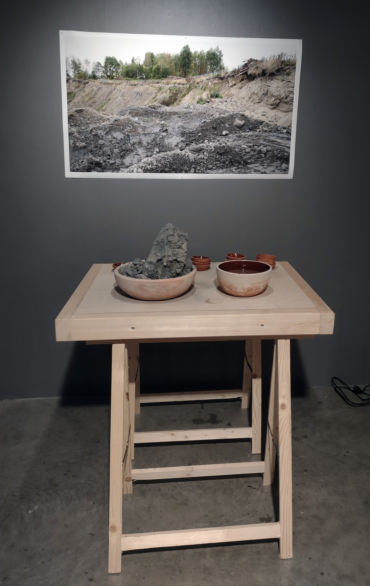 En fjernjordingsøvelse er en deltagende øvelse med blåleire, der vi fra avstand, og i dette tilfellet fra ROM for kunst og arkitektur, prøver å koble oss på en spesifikk leire og landskapet den kommer fra. Dette er kanskje selvmotsigende. Hvordan kan man få denne direkte koblingen på avstand og i et gallerirom? Jeg tenker på gallerirommet også som et landskap som kan gjøre noe som leirelandskapene ikke kan, som er stabilitet i temperatur, lys, humiditet og åpningstider med personale. Jeg har valgt å representere stedene og landskapene med fotografi, og leirene i forskjellige tilstander som for eksempel våt suppe, plastisk eller knusktørr. Jeg har skrevet spesifikke instrukser63 som guider hvordan publikum kan velge å interagere med leirene. Koblingen skjer ikke hovedsakelig gjennom å passivt betrakte landskapet, men ved å grave, kjenne, lukte, bære, holde og sammenligne leira. I utviklingen av hvordan disse øvelsene har blitt til har jeg utforsket grunnleggende leire-til-keramikk teknologi, men også 3D-skanning, 3D-printing og digitale verktøy, for å få en kroppslig erfaring med leirene og leirelandskapene64. En periode tenkte jeg det digitale aspektet ville fylle mye mer i det kunstneriske resultatet, men fjernjordingsøvelsene har på nåværende tidspunkt gått i retning av grunnleggende leirebearbeiding, og observasjoner og sanselighet som oppstår i disse prosessene. Jeg jobber derfor med syn, lukt, lyder og forskjellige fysiske måter å være med leira på, tørr, våt, plastisk, rennende, og så videre. Subtle ground-prosjektet kommer inn på keramikeren og får uttrykt noe av den respekten og omsorgen som utvikles for materialet når man lærer et håndverk: