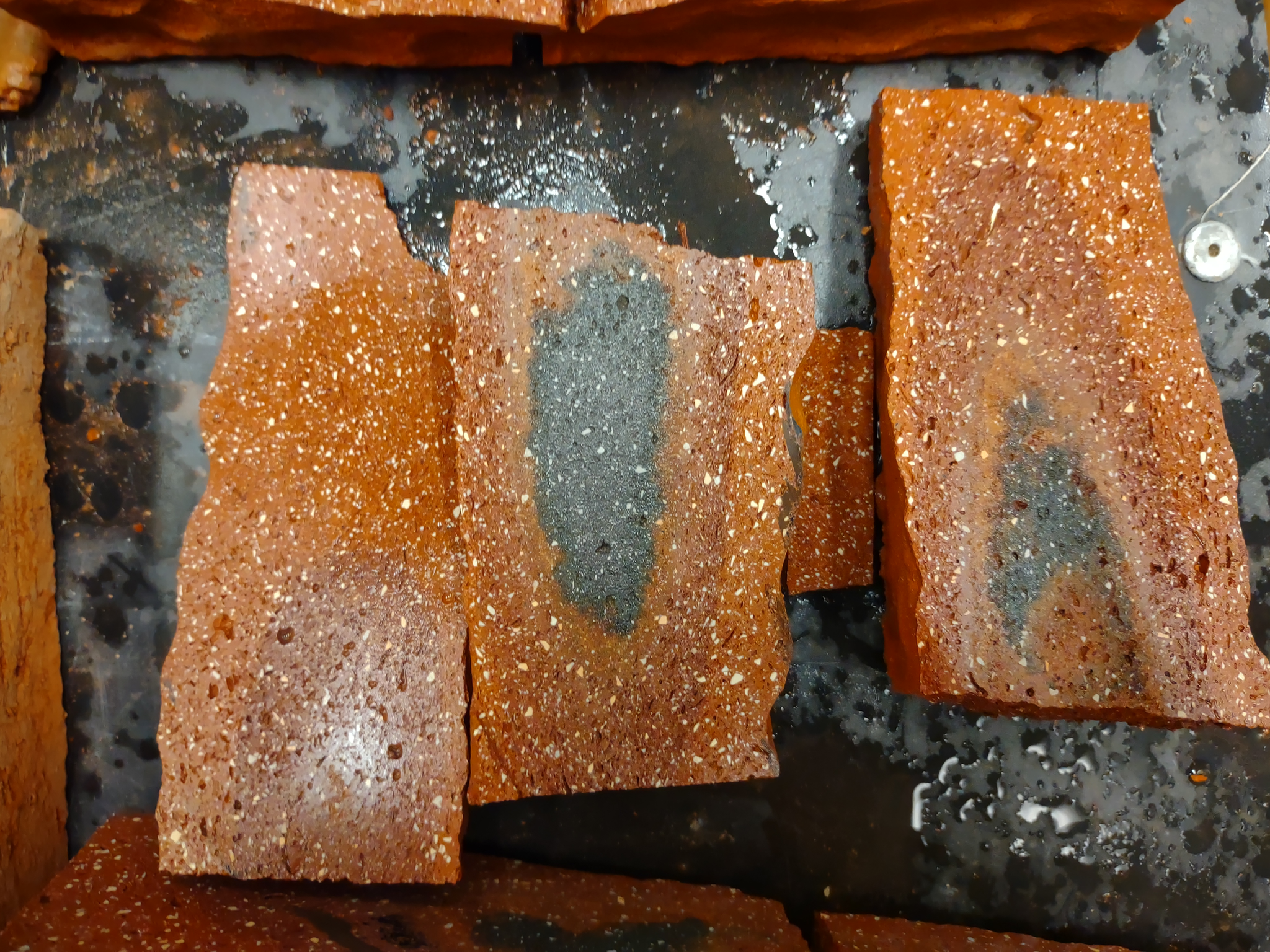 JA Ja, og jeg vet ikke om noen andre land som har børsta overflate. Jeg synes den var veldig fin når vi hadde den hjemme, for ungene kastet bare luene og vottene sine på veggen, så hang de der av seg sjøl. Men den er ikke populær nedover. Så har du den glatte som er motsatt. Den blir liksom mer ensartet og kanskje litt skarpere i fargen fra der den har stått åpen mot ovnsatmosfæren eller fra der det har ligget en stein oppå en annen stein i oven, og når vi kjørte med reduserende flamme som vil si at vi bremser ned på oksygentilførsel og så puttet på mer brennstoff. Det beste er jo å gjøre dette her sånn som i gamledager når de fyrte med kull, for i kull er det masse gasser som er med og lager fargen, og olje er bra, gass er mindre bra, da er det vanskeligere å få det fram. Den er så rein og det er ikke så mye forurensing, forurensing i olje er jo med og lager dette her i ovnsatmosfæren. Så stiger temperaturen litt når vi kjører inn de pulsene med olje, og så er det ikke nok oksygen inn i ovnen til å holde forbrenningen på grunn av at det er så veldig varmt inni der, så tar flammen et oksygenatom ut av teglen så får du disse svarte feltene.