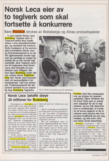 6 "Bratsberg teglverk gjorde de første forsøk med Poroton i 1971. Poroton er en måte å fremstille tegl-blokker på, patentertav den svenske ingeniøren Sven Fernhov. Leiren tilsettes polystrenplast, som fører til porer i teglet, og at man for et lettegl med meget lav romvekt." Lest på teglverk.no 25.07.2024