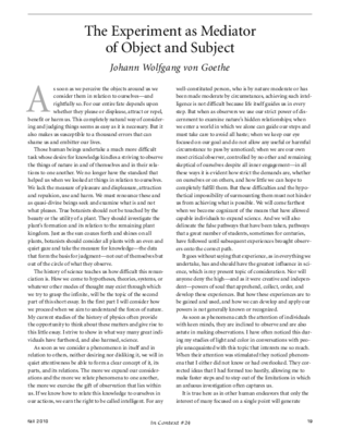 In Goethe’s scientific experiments the main object of investigation are natural phenomena like plants, and color. According to Goethe we should not try to directly prove or confirm, a theory or hypothesis, through experiments. He says that experiments do not prove anything, and claiming they do is potentially harmful. Just as every single experiment through which we reproduce an experience, every single experience is essentially, and by nature, an isolated piece of knowledge. On the other hand, he says, the power of the human mind seeks to unite experiences with tremendous force. Because of the dominance of our teachings and experiences, our mind is constantly tempted into historical frameworks. The experiment should break with pre-set theory and only mediate the subject and object — to try and create a situation in which the object can be newly seen.