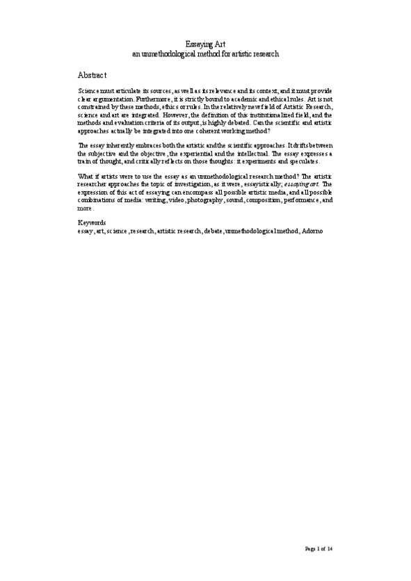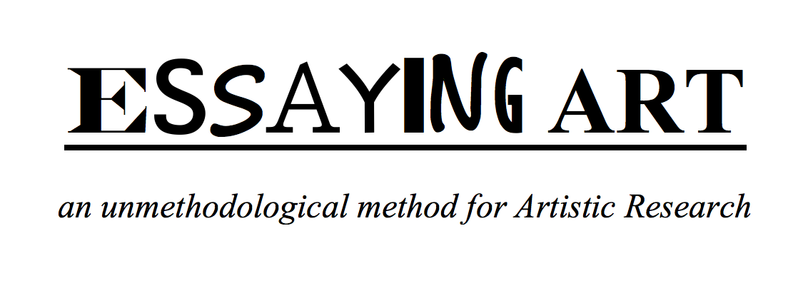 This research is about Artistic Research education. Artistic research is a relatively new academic field where science and art are integrated. But defining this institutionalized field, and the methods and evaluation criteria of its output, is highly debated. There is no one universal definition, criteria or evaluation for this in this educational field. Which isn't surprising considering that both the artistic as scientific element can consist of a vast verity and combination of fields, topics and disciplines[1]. But definitional difficulties are also inherent to the field because the scientific and artistic methodologies are subject to different criteria. Science needs to articulate its sources, as well as its relevance and its context, and it must provide clear argumentation. Furthermore, it is strictly bound to academic and ethical rules. Art is not constraint by these methods, ethics and rules. Can we integrate the scientific and artistic in a working method? The essay inherently embraces both the artistic and the scientific. It drifts in-between the subjective and the objective, the experiential and the intellectual. The essay expresses a train of thought, and critically reflects on those thoughts: it experiments and speculates. What if artists use the essay as an un-methodological research method? The artistic researcher approaches the topic of investigation essayistically; essaying art. The form of expression can encompass all possible artistic media, and all possible combinations of media like: writing; video; photography; sound; composition; performance and more. In order to put this theory to the test, I have formulated an elective course for first-year students of the research master Artistic Research at the University of Amsterdam (NL). In this experimental pilot, I investigate how an essayistic approach to artistic research could be practically used as an unmethodological method for developing individual Artistic Research form and approaches. This research describes, evaluates and critically reflects on the educational project and the theoretical debate in Artistic Research.