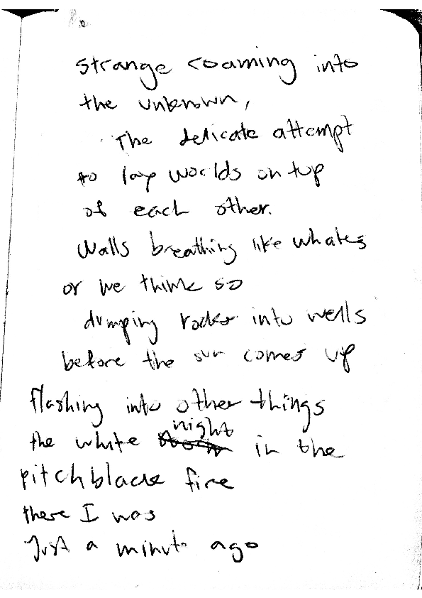 I move into a darkness, a place far far back. I write that as well. Then I’m back, “Hallelujah”I write. A door cracks in my lungs. I listen. Listen for myself, inside my skin. I see red. I see elephants.