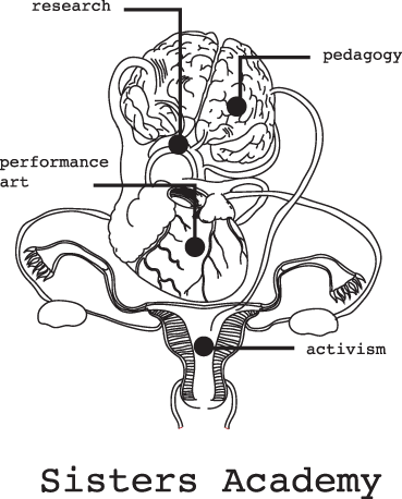 But what does this mean, exactly? What is Sisters Academy? Well, it is a grand-scale performance project operating in the cross-section between performance art, pedagogy and humanistic research. It is a school, an academy, but with no fixed location. As any performative space, it is installed - or in the vocabulary of Sisters Academy, it manifests. Sometimes on its own (Sisters Academy - The Boarding School in Malmö) or, as now, within an already existing educational institution. The Takeover of Nova Academy is the third manifestation of Sister’s Academy.