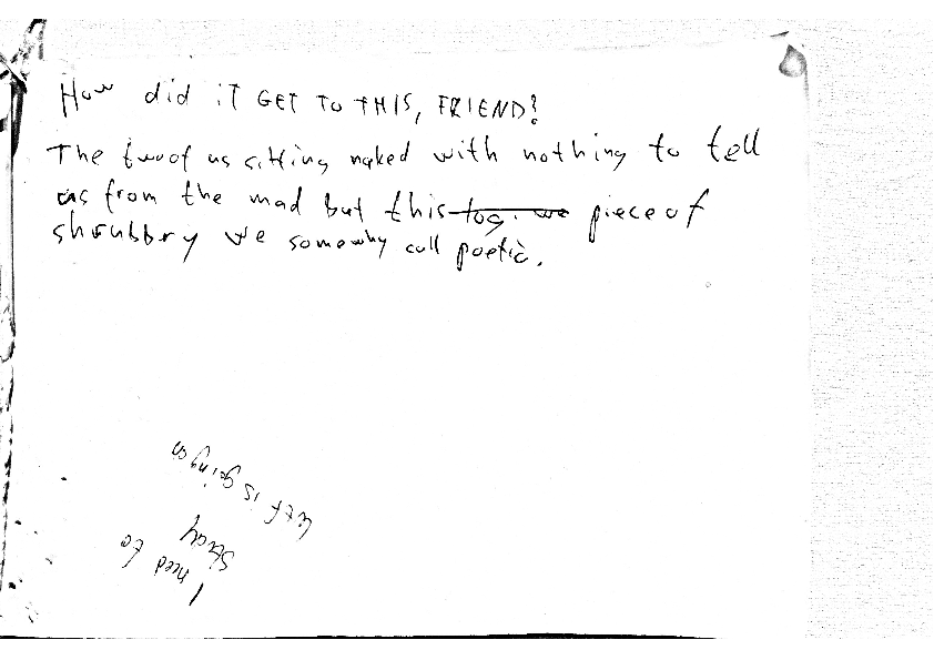 How did it get to this, friend? The two of us sitting naked with nothing to tell us from the mad but this piece of shrubbery we somewhy call poetic.