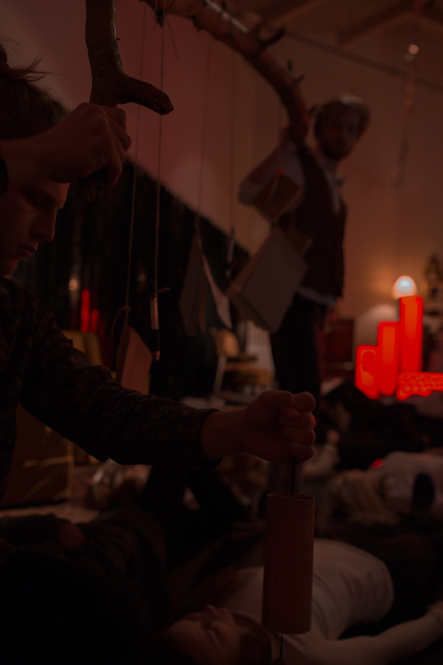 The poetic stick has to be carried by both of us, one in each end. The notebooks and pens swing softly from side to side as we take slow, careful steps between the recumbent students. From time to time the Vibrator bends down, playing the wind chime close to the student’s ears.