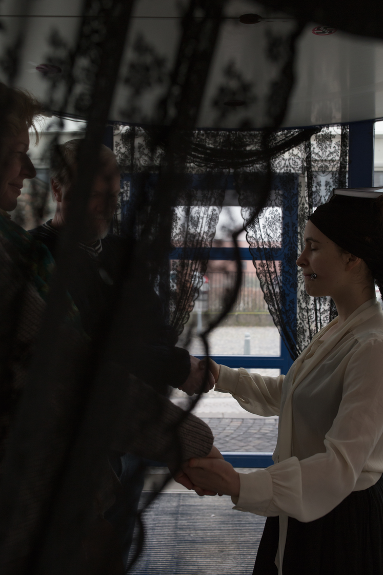 The Sister takes the stage. Dressed in a black gown and white bonnet, she looks like a mixture of a nun, a maiden temptress – and a dark fairy-tale queen.