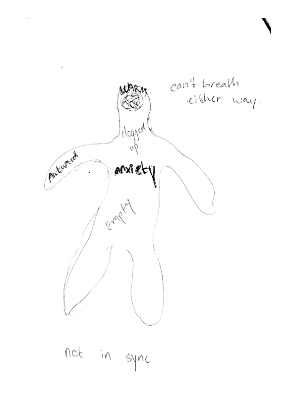 “Where does the sound enter your body? Where does it show itself? Please write,” he says with a loud, chanting voice. Then, suddenly, he bangs his knuckles against the stick. He doesn’t sound or act like his everyday self. But he also isn’t. At the moment he is The Vibrator. His poetic self.