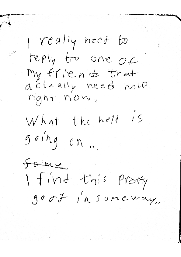 She seems both excited and content, as she elaborates on her experience: Apparently, during the writing, her self-experience became so organic that she felt connected to everything that is, has been and will be. Out of this sense of belonging she started writing on her own body, because the white paper seemed more and more foreign to her. The words simply moved from the notebook onto her hand, like ants crawling back to the anthill. Eventually, she stopped writing words altogether, drawing patterns on her own skin instead. But before her way of expression left language behind, these words manifested in one of our notebooks: