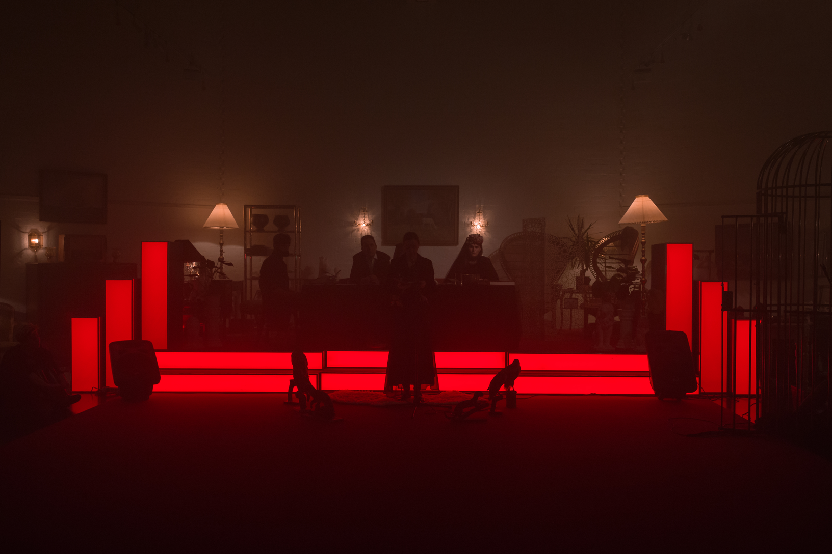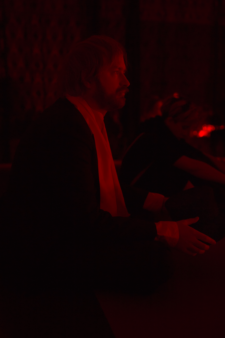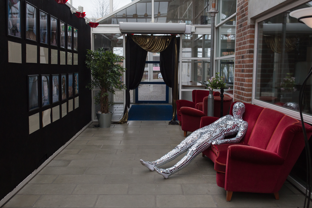 If this scenario wasn’t weird enough in itself, the surroundings surely make up for it. Black velvet covers the walls of what used to be an ordinary Swedish high school. An eerie lynchian soundscape is constantly heard from hidden speakers. In a nearby room, sand is running through hanging bowls, forming fine piles on the floor. A person dressed in a thousand small mirrors walks by, scattering the sunbeams falling from the window ceiling.