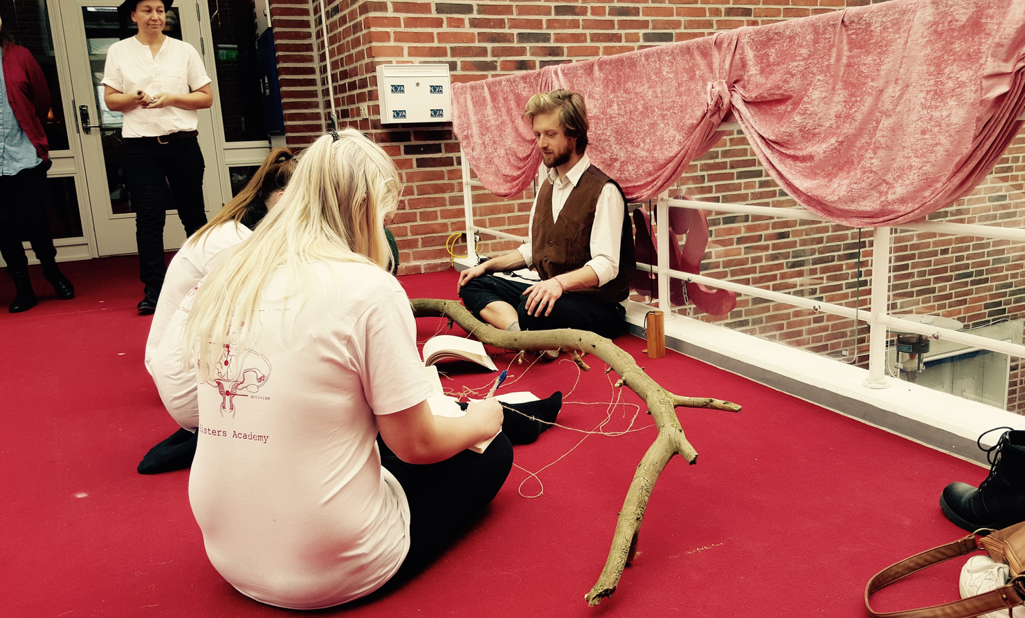 In the conversation we have with him afterwards, it becomes clear that he has had a lot of experiences in his short life that are difficult to put into words. So we circle around the ineffable, the three of us. As we do, I experience this very moment that we share as something that cannot be put into words. There is a sort of radiance to it. A state of togetherness that I only experience with close friends. Actually I have felt this with all of the groups of students we have met through this day. Maybe this is why I feel that they are a “success”? Here with The Youngster, though, is where I experience it the strongest. That we enter this state at all has a lot – if not everything – to do with the environment of Sisters Academy. It is one of the strongest qualities of this performative space: That it allows humans to break through the barriers that usually make it difficult to connect with strangers. The main source of the heightened sensitivity and strong connection with each other, which all three of us obviously experience, is the intimate space opened up by Sisters Academy.