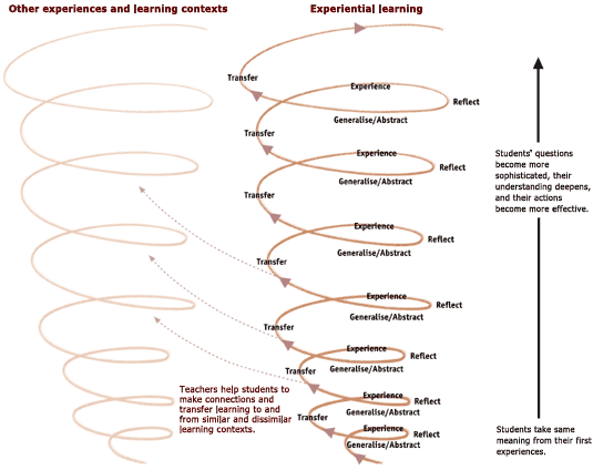 Experiential learning is a process of constructing knowledge that involves a creative tension among the four learning modes [concrete experience, abstract conceptualization, reflective observation, and active experimentation]. This process is portrayed as an idealized learning cycle or spiral where the learner ‘touches all the bases’ — experiencing, reflecting, thinking, and acting — in a recursive process that is responsive to the learning situation and what is being learned. (A. Kolb and D. Kolb 2009: 298)