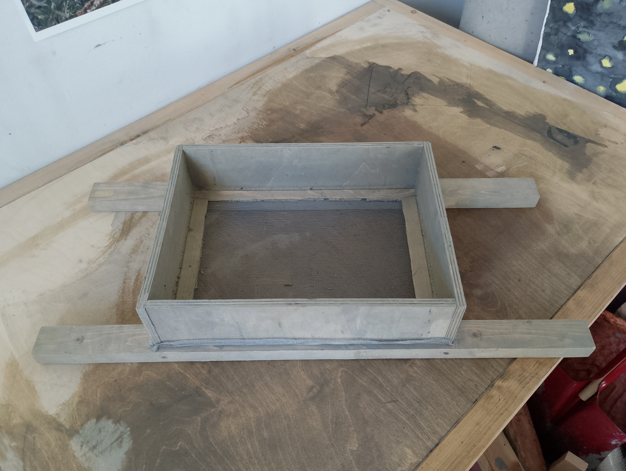 Først tørker jeg all leira og når den virker gjennomtørr tar jeg klumpene over i en beholder og heller på vann til over klumpene (jeg har en idé om at varmt vann gjør at prosessen går fortere, men jeg er ikke helt sikker på om dette stemmer). Når dette har stått et døgn eller to har vannet trengt inn mellom leirepartiklene og det er enkelt å mikse det opp til en tjukk rømmeaktig konsistens. Så skal det siles. Jeg har bygd en sil som har nett omtrent som en kjøkkensil som ser sånn ut: