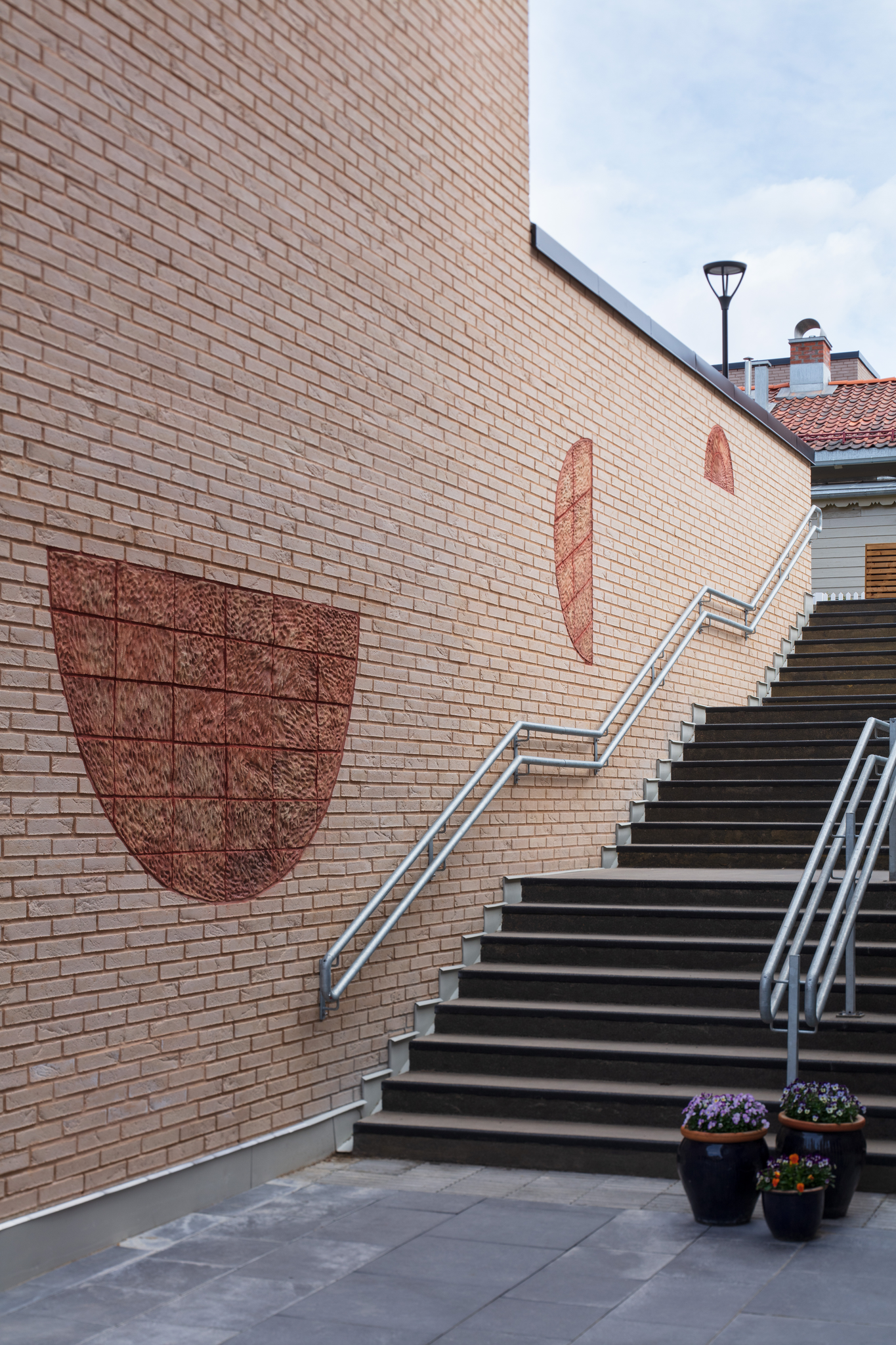 Da jeg startet doktorgradsforløpet i desember 2020, var jeg allerede i gang med et ‘kunst i offentlig rom’-oppdrag for Oslo kommune. Dette var til den nye demenslandsbyen Dronning Ingrids hage på Lilletøyen, som er en lukket “landsby” med blant annet butikker og frisør, der demenspasienter både kan bo og gå fritt rundt omkring. Jeg ble spurt om å lage noe til en utendørs teglfasade i en trappeoppgang, og bestemte meg for å bruke blåleire fra Feiring Bruk, avdeling Kulmoen, originalt fra Alnabru til dette. Jeg har gått mye frem og tilbake på om jeg skulle ha med dette prosjektet som en del av refleksjonen, da det allerede var påstarta i det jeg begynte doktorgraden. Jeg har kommet fram til at det er viktig, både fordi det gjorde at jeg måtte oppsøke hjelp til hvordan jeg skulle bearbeide blåleira i fagfeltet, men også fordi jeg utviklet en frostsikker masse1 som er faglig relevant å dele videre med fagmiljøet. Jeg tror det at jeg startet med å allerede være inne i dette oppdraget, gjorde at doktorgradsprosjektet ble formet i en spesifikk retning med blikk på hvordan blåleira har blitt brukt i samfunnet.