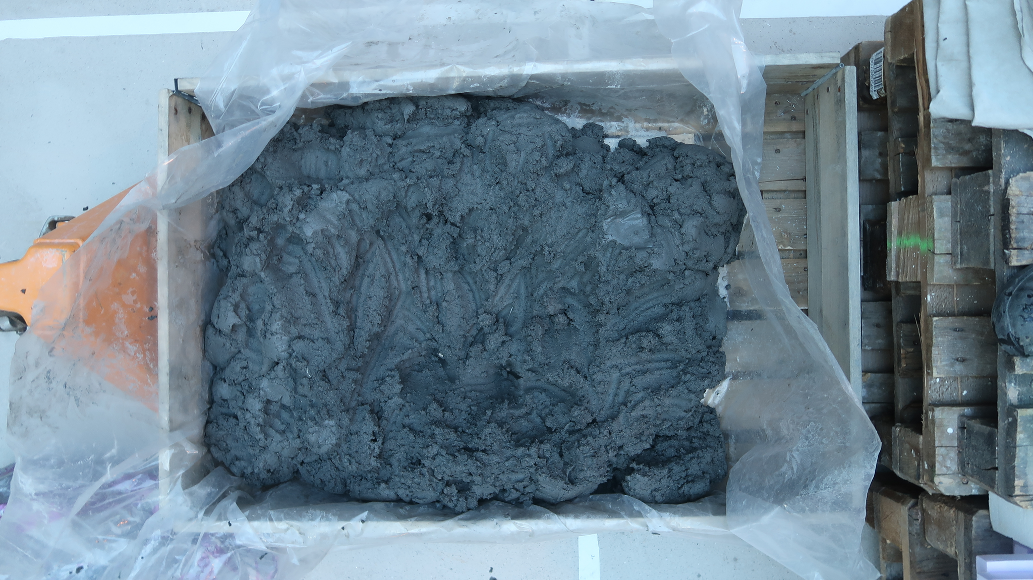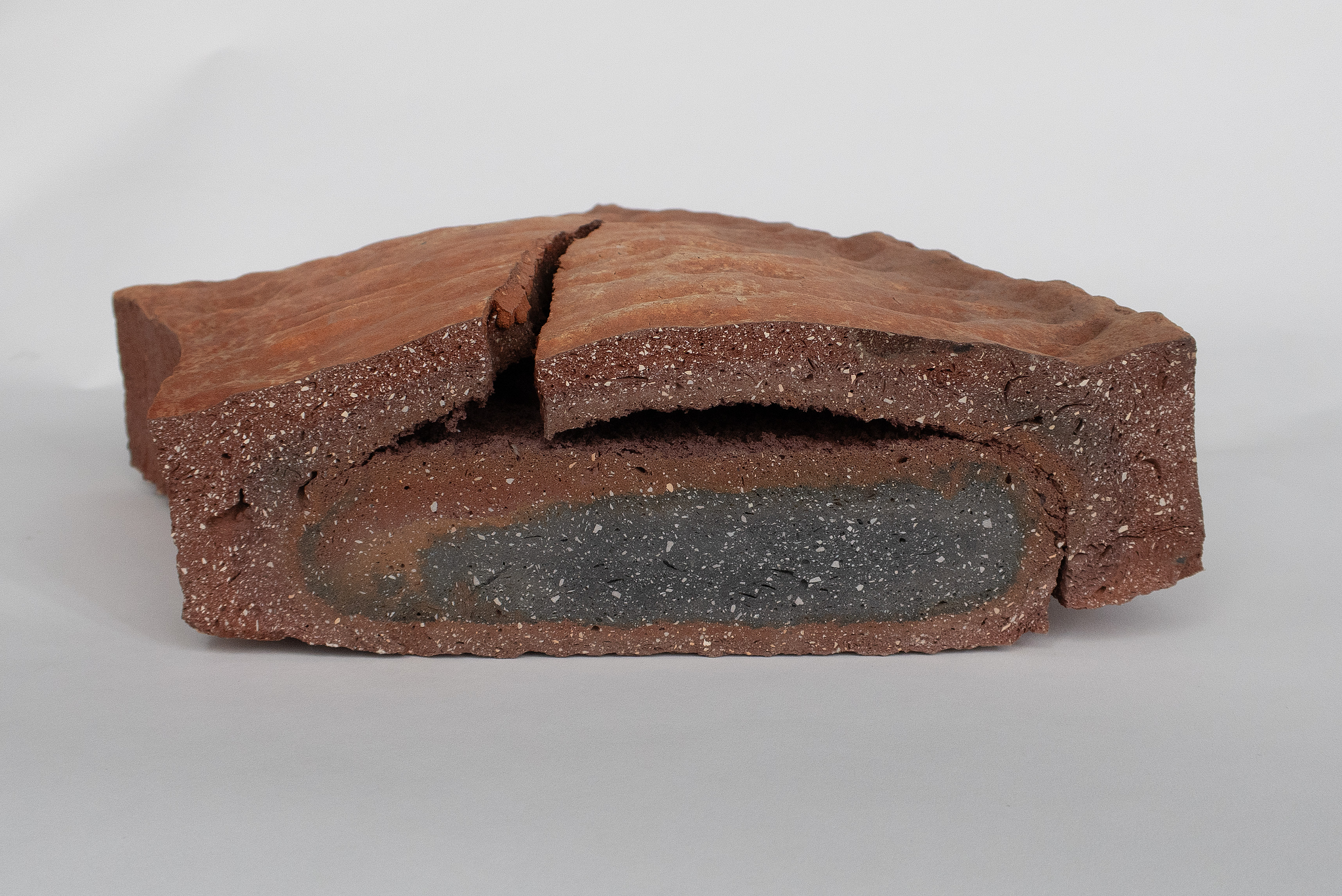 Relieffet hadde en tykkelse på 6 cm og jeg lot det tørke veldig sakte, ca. en måned under plast og stoff og så i tørkeskap en uke på 40 grader. Selve brenningen var til 1030 grader C og den gikk veldig sakte både opp og ned med 25 minutter utligning på topptemperatur slik at gassene og rester av vann inni keramikken rekker å komme ut. I den misbrente relieffbiten ser man hvordan det har blitt dannet en slags lokalreduksjon inne i keramikken.