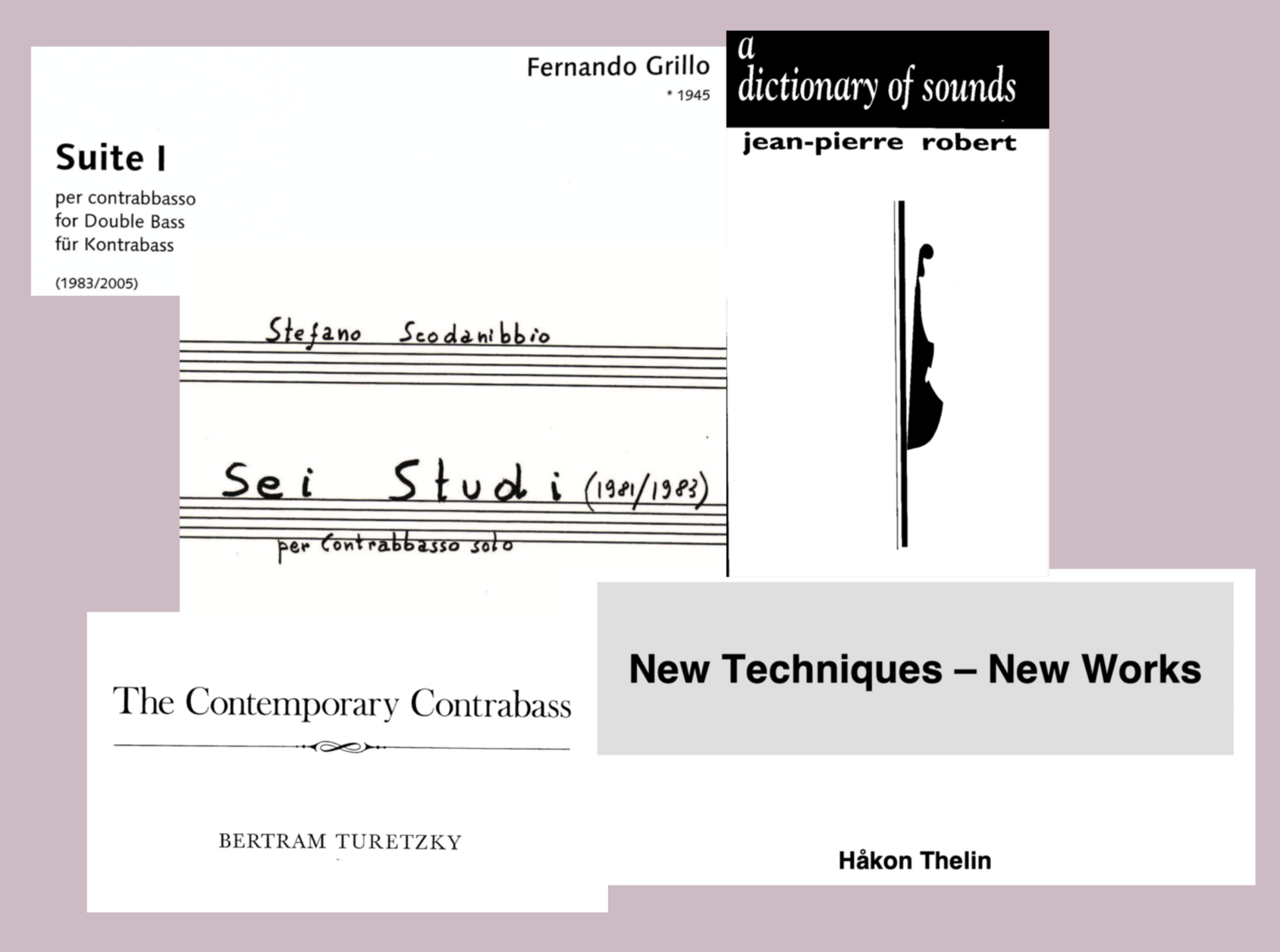 In the beginning, there are the "confines of a limited material universe" (Peters 2009, p. 11). The instrument itself, with all the historical and cultural connotations it embodies, provides a framework—a starting point on which we can build. The first steps of my research involved expanding my perception of the information embedded in the instrument. Because of various factors—the structure of the institutions in which I have studied music, the cities I have lived in and their accompanying scenes, and the musical language I have been exposed to—I ultimately had to realize that I possessed several “blind spots” in the developments of the contemporary double bass, a lineage that I perceive to be formed by Fernando Grillo and Stefano Scodanibbio in Europe, and Bertram Turetzky and Mark Dresser in the US, with various international proponents such as Joëlle Léandre, Håkon Thelin, and Barry Guy (just to name a few) filling in the picture. Many of these wonderful artists have left traces of their developments in the form of compositions, elaborate performance descriptions, and complete methods that aim to encompass all the technical particularities of their era (Robert 1995; Thelin 2011; Turetzky 1974).