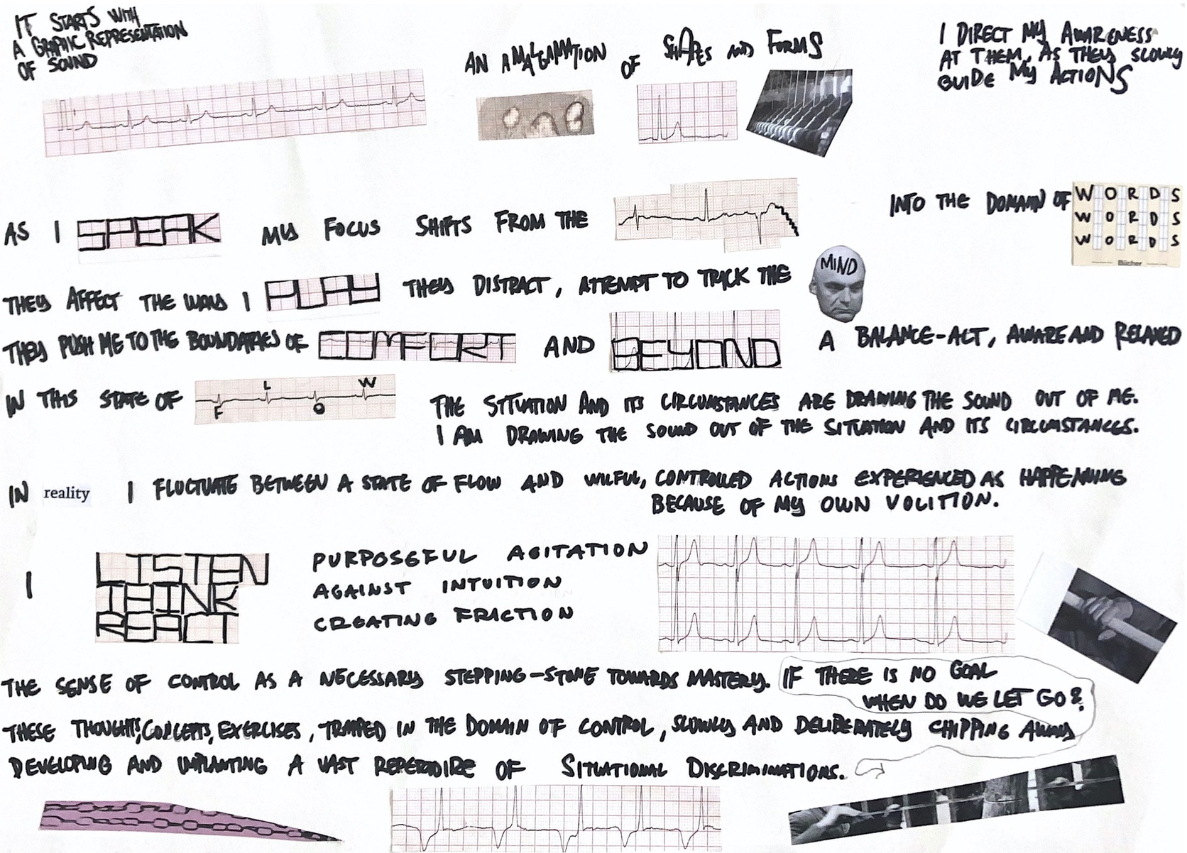 “Reflection-in-action taken too literally.” A quote from a later performance that became a connecting thread for all iterations of the Performing Reflection projects. The first attempt, designated 0.5, was performed with the use of training wheels—a graphic score and a prepared text stood in for the verbal part, serving as a form of pre-reflection that guided both the reflection-in-action and the musical material.