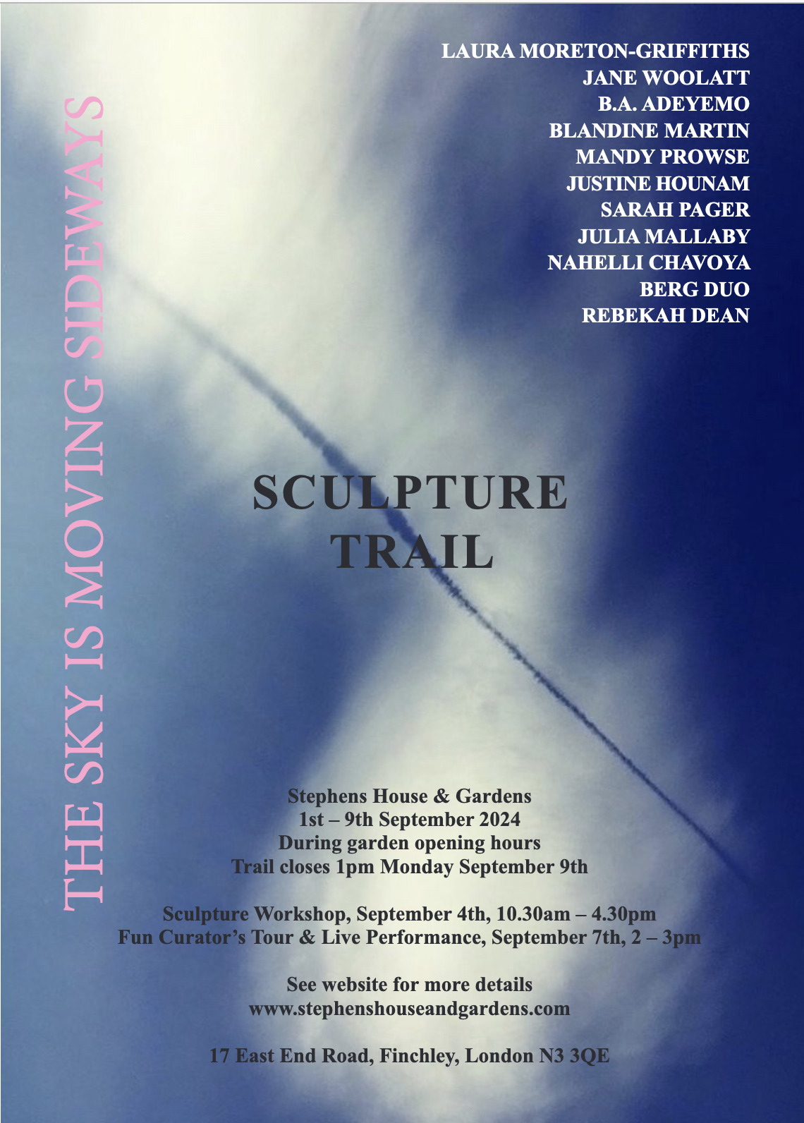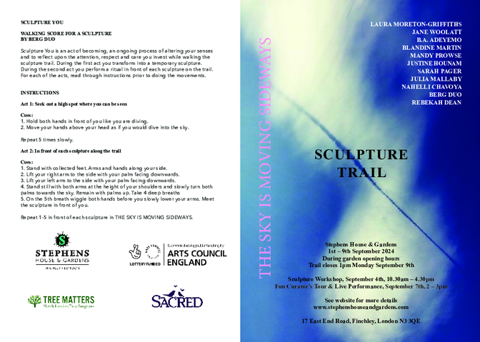 "The Walking Score, SCULPTURE YOU, was performed as part of The Curator’s Tour for The Sculpture Trail, ‘The Sky is Moving Sideways 2024’, and was made available to the public on the back of the trail’s free colour map. It took place at Stephens House & Gardens, a North London, grade two listed mid-Victorian museum building, with ten acres of landscaped gardens, and a history dating back to the thirteenth century. The score was performed by myself, and the Artist Laura Moreton-Griffiths, and written especially for the trail by the Swedish Artists, BERG DUO. The trail was funded by the Arts Council England.