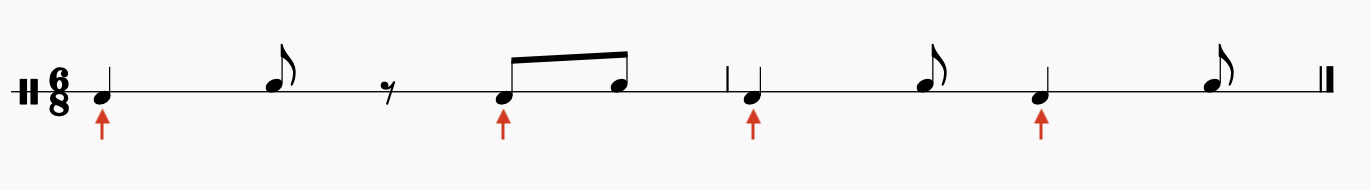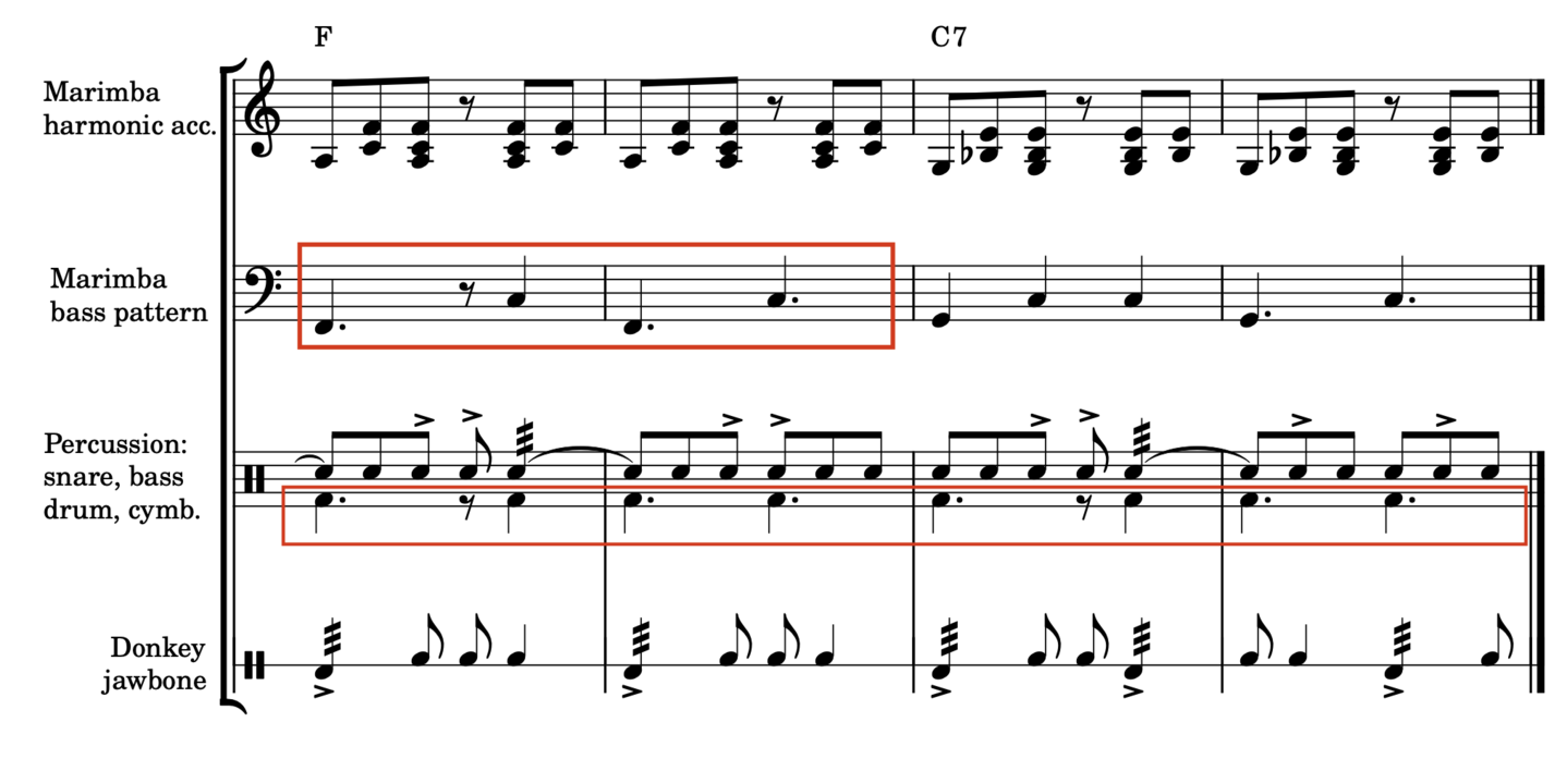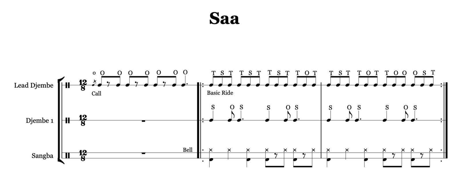 The first thing you may notice is the difficulty in identifying where the “one” is. Personally, it took me several times to understand what was going on, as I naturally felt the “one” as the pattern I know from son de toros. This made me reflect on the concept that Konaté and Ott (1996) talk about called Beat change, beat shift. When listening to the Saa recording, one can easily feel the “one” either on the high note (slap) of the djembé, when it is actually accentuating the third note of the triplet, or on the lower drums (sangba/dununba).