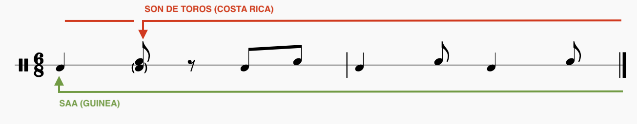 This led me to explore in the first stage some rhythms coming from regions such as Senegal and Guinea. Precisely in Guinea, I found a rhythm that caught my attention called “Saa”. This song has a rhythmic structure very similar to the son de toros, however, it starts in a different part of the beat, as follows: