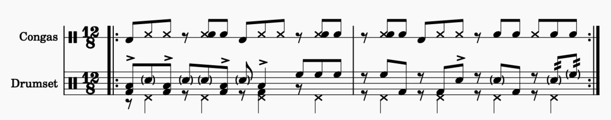 The following examples will show the process of creating new ideas through constant repetition and experimentation in the practice room. The instruments mainly used were: drumset, conga, cajón, and piano.
