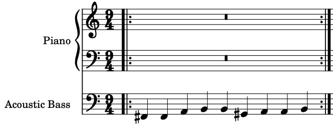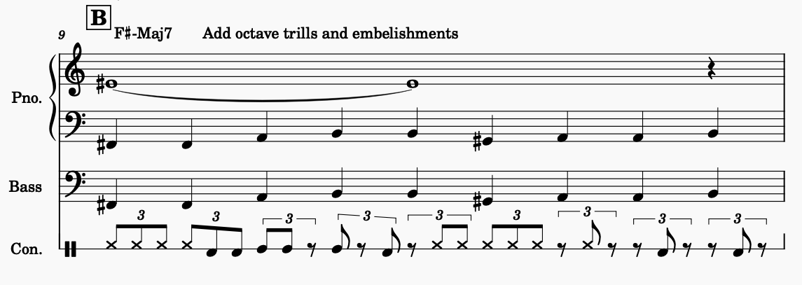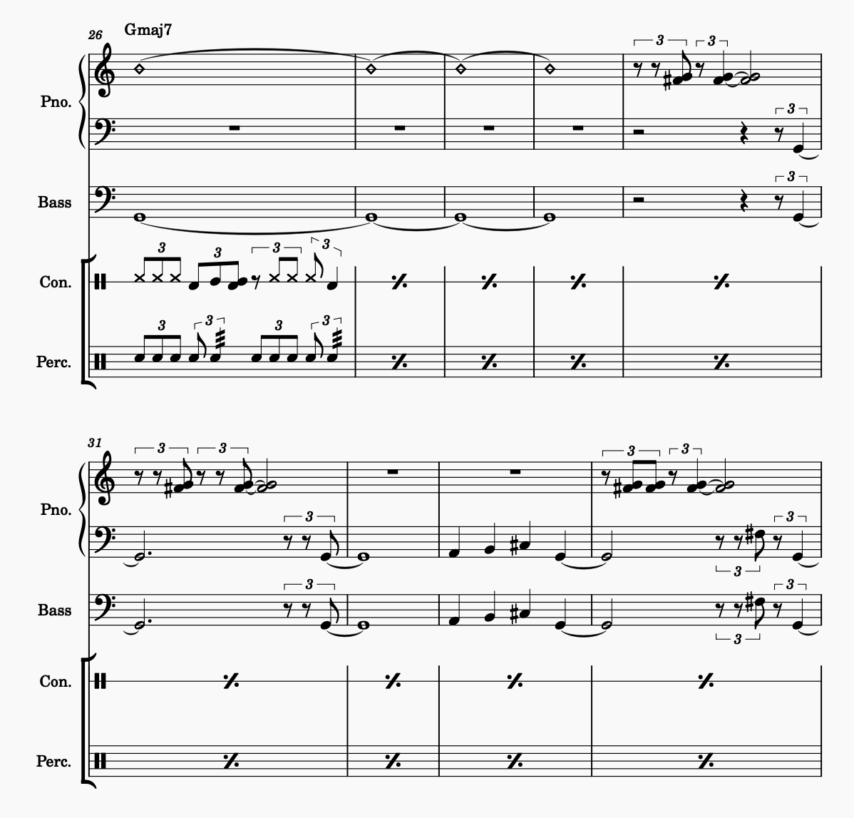 Using this bass line and drum groove as a foundation, I composed a melody primarily featuring long notes. Although the melody can be played with rhythmic accuracy, it should maintain some flexibility to complement the groove established by the double bass, percussion, and drums. This approach allows the pianist some room for interpretation and personal expression. When I shared this initial idea with my composition teacher, Hans Feigenwinter, he questioned whether the melody was intended solely for the piano, noting that the register is relatively low and might be hard to hear within the full band ensemble, which includes bass, drums, and percussion. His feedback prompted me to reconsider aspects such as orchestration, dynamics, and embellishments.