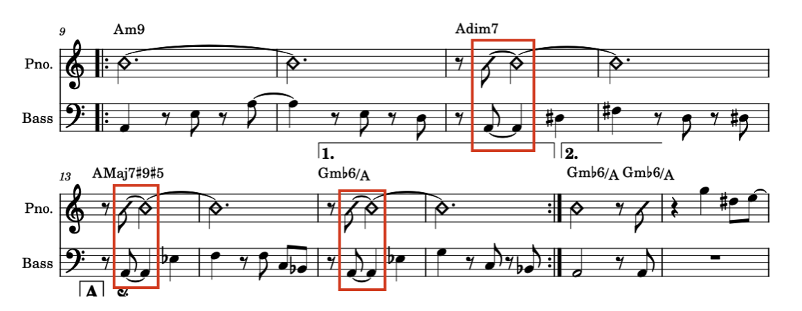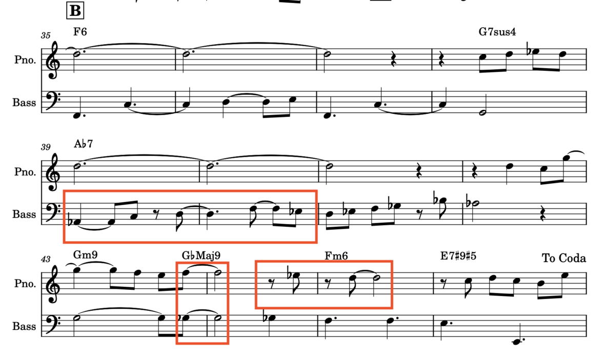 Some of the rhythms and accents of the bass line ostinato are implied and can be found in the melody and written bass line for the “head” of the tune.