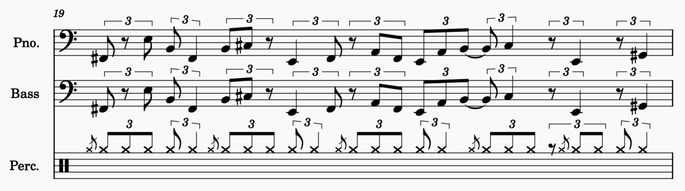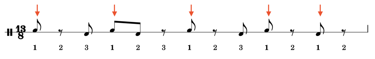 This inspiration led to a duo improvisation based on a single rhythmic idea in 13/8. The piece revolves around a singular, compelling rhythmic motif that defines the entire composition. This motif is structured in a 13/8 meter, creating an intricate yet captivating pulse that drives the piece forward. The rhythm can be broken down into smaller, more familiar groupings to help grasp its feel. In this case, the 13 beats are grouped as 3+3+3+2+2, providing a dynamic flow and emphasizing different beats within the bar. This pattern is based on parrandera but with the addition of one extra beat for a unique twist.