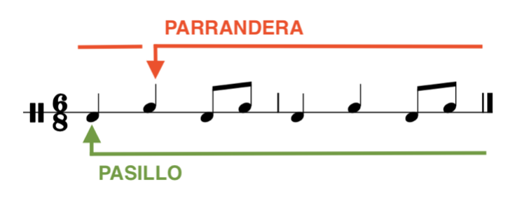 The next excerpt shows the use of rhythms previously heard and analyzed, now employed in different parts of the beat and bar. Inspired mainly by parrandera, these rhythms are also supported by drums and percussion.